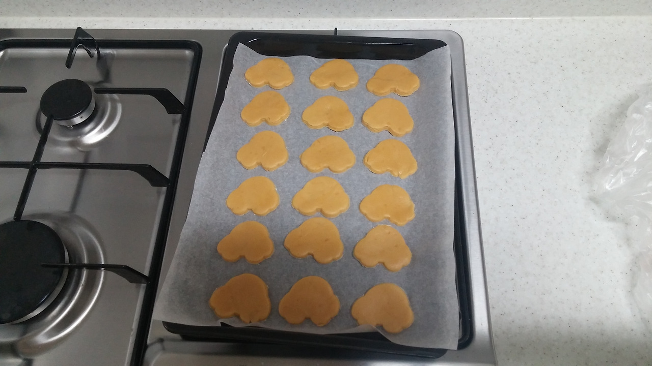 모양틀로 찍고 유산지를 오븐 팬에 깔고 올려줍니다.