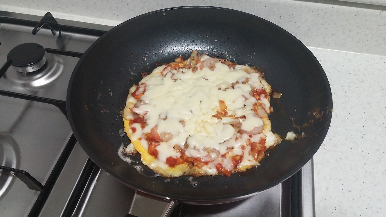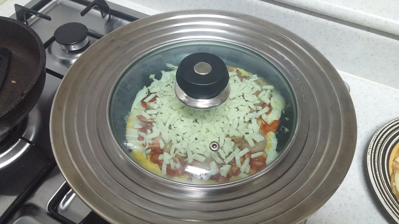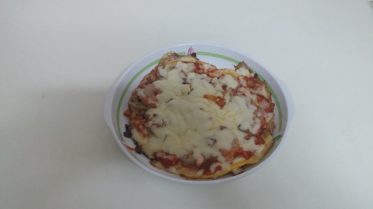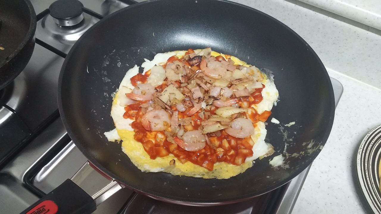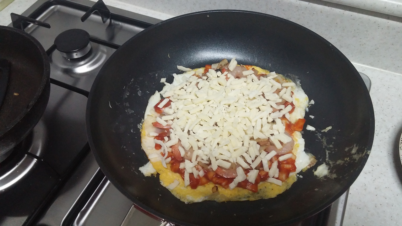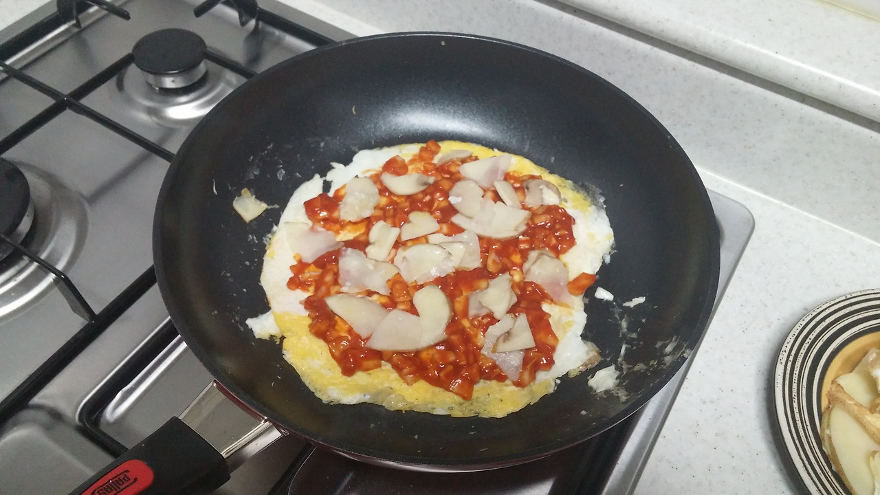 아까 소스에 양파를 넣고 계란 위에 펴주고 감자를 올려줍니다. 사진이 더럽네요... 아직 뒤집기를 잘 못해요...