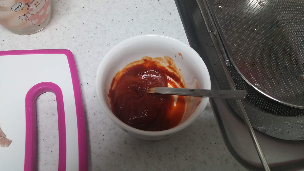 고추장이랑 케찹을 반반해서 섞는데 케찹 넣기 전에 고추장이랑 뜨거운 물 조금만해서 먼저 풀어준 다음 케찹이랑 섞으면 더 잘 풀어져요!