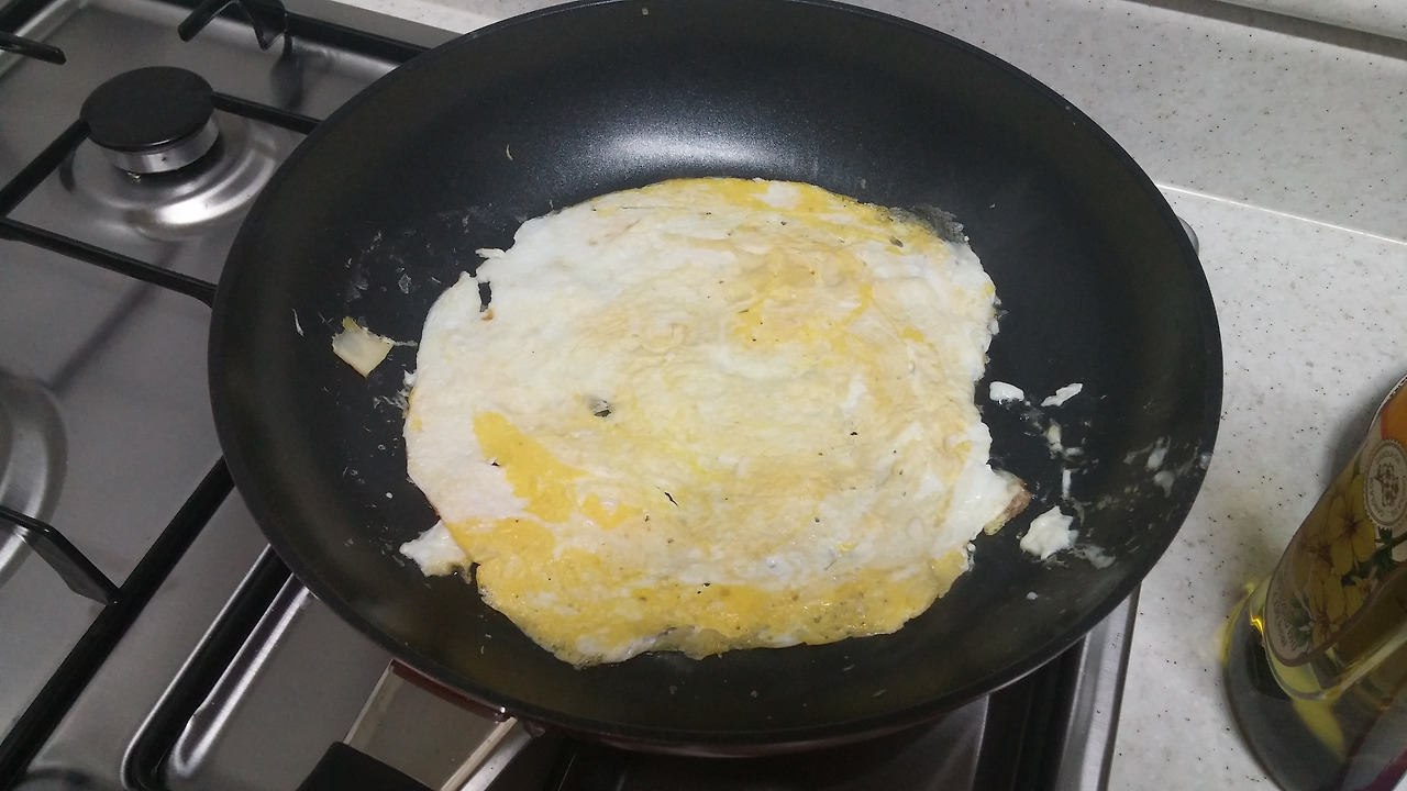 사실 감자를 도우로 쓰려고 했는데 감자칼 써서 얇게 썰다가 감자칼이 부러져서 계란으로 도우 하려고 계란 두개 깨서 풀어줬습니다. 한번 뒤집을 때 기름 두르고 뒤집어주세요.