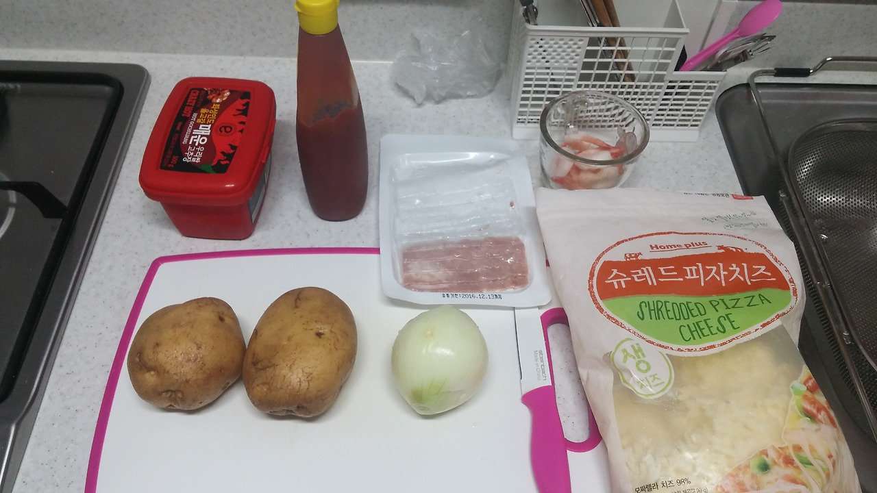 감자, 양파, 베이컨, 새우, 치즈, 고추장, 케찹, 계란(사진엔 없어요!)