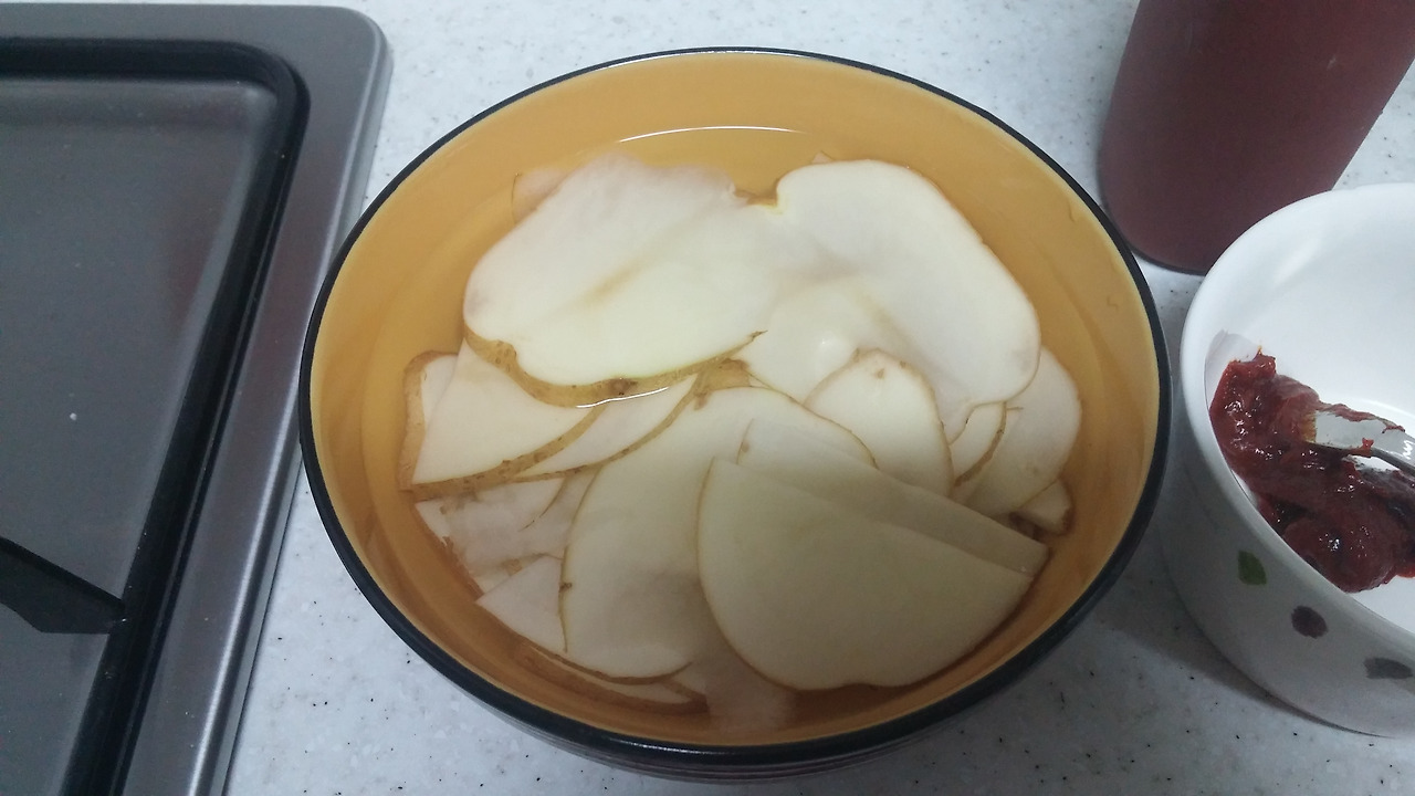 감자를 얇게 썰어서 물에 담가주세요. 한개만 썰었어요.