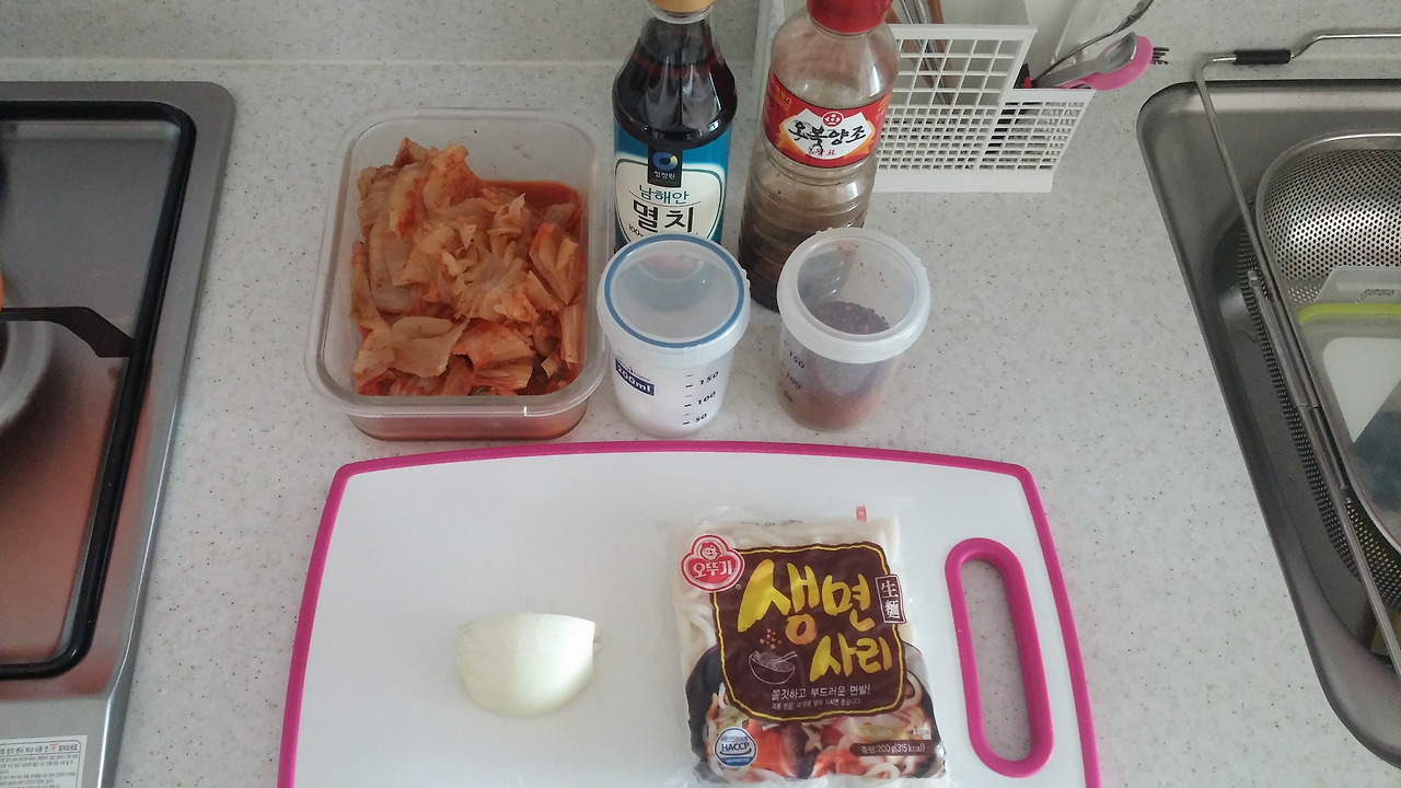 우동사리, 양파, 김치, 소금, 고춧가루, 멸치액젓, 국간장, 설탕