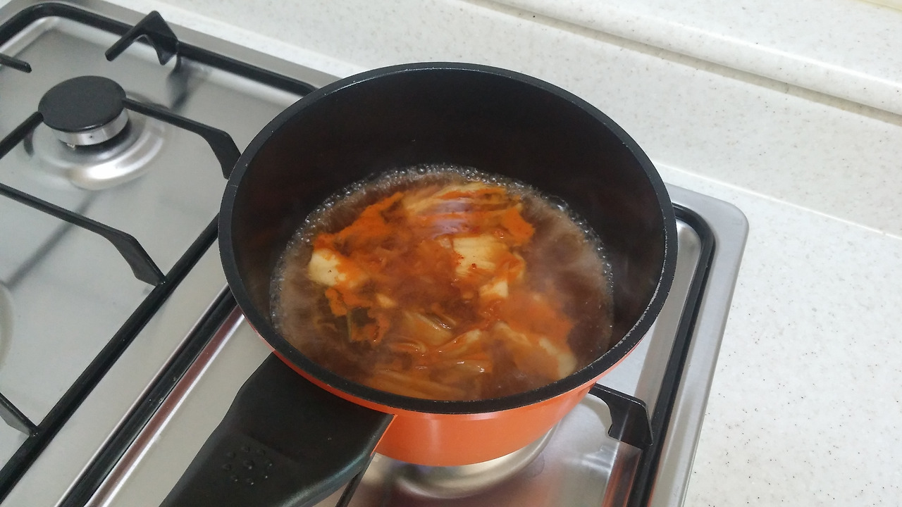 김치와 국간장 1숟갈, 멸치액젓 1숟갈을 넣고 끓입니다.