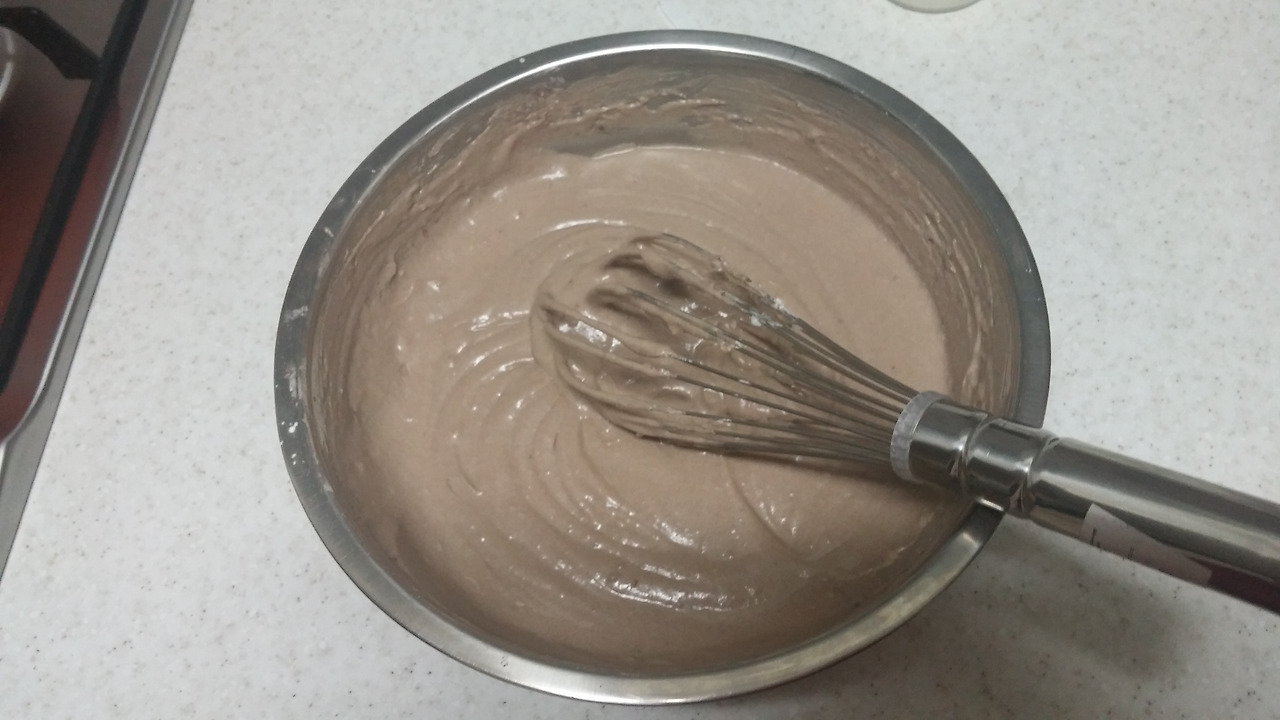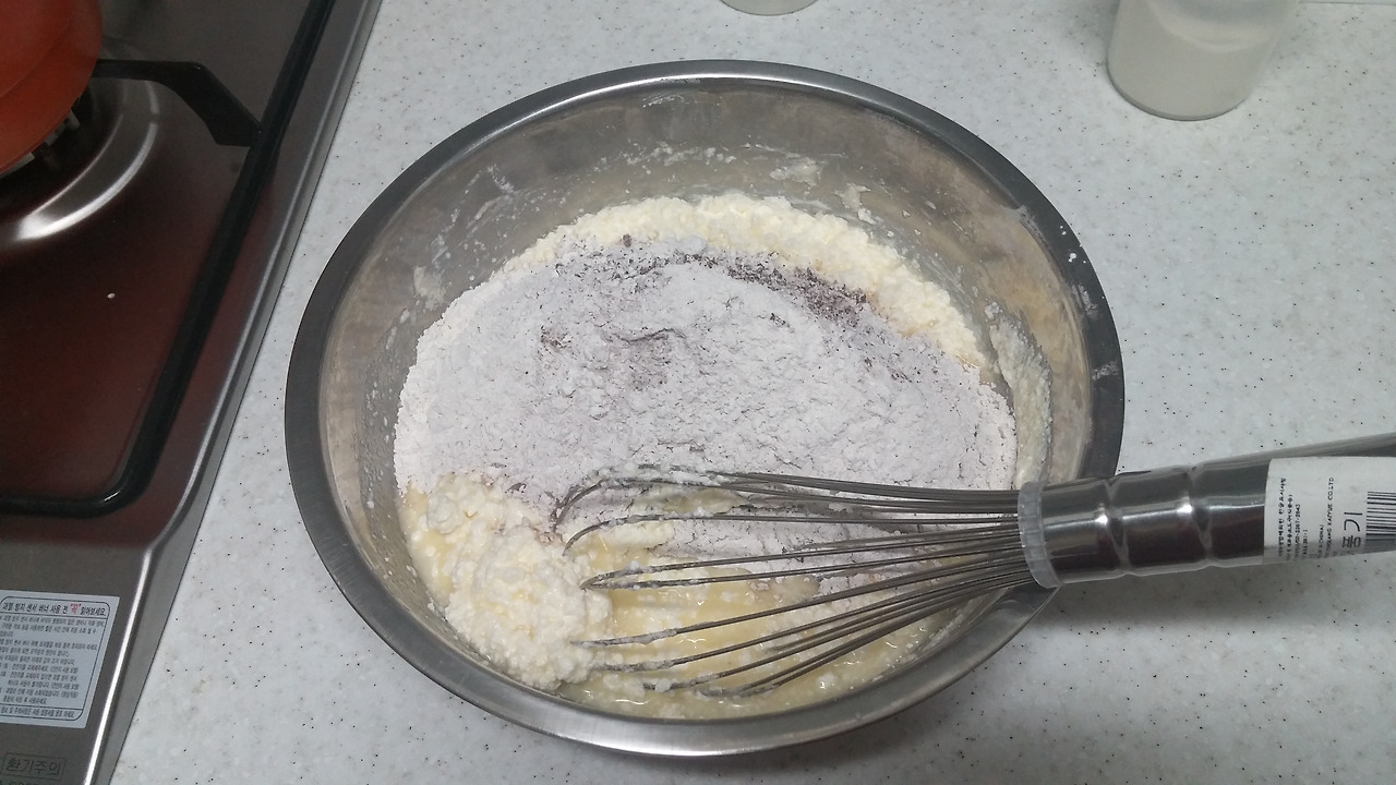 버터밀크(우유 180g + 식초 4t)를 넣어주고 체친 가루류(박력분210g, 코코아가루6g, 바닐라향 4g)를 넣어서 섞어줍니다.