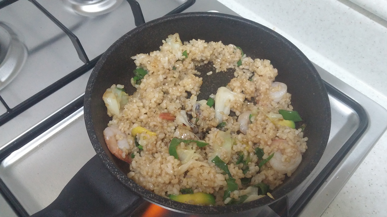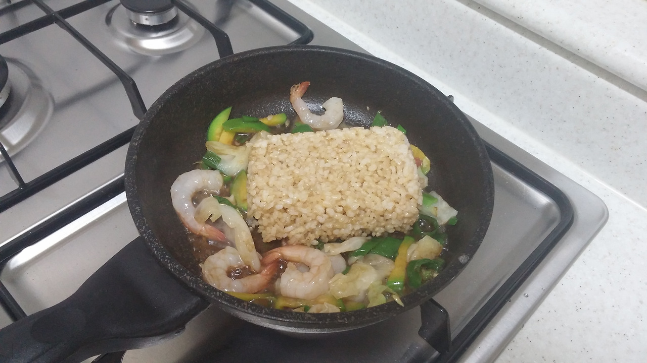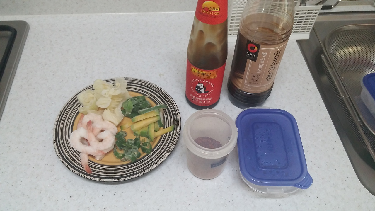 굴소스, 간장, 고춧가루, 새우, 양배추, 대파, 애호박, 땡초, 밥 (야채는 집에 있는 거만 넣어도 돼요)