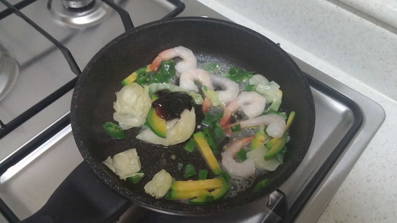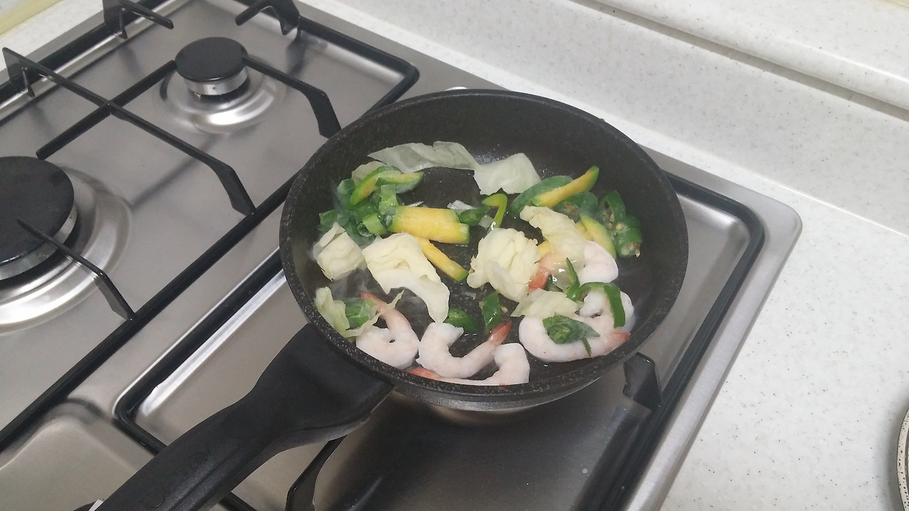 양배추, 새우, 애호박, 대파, 땡초를 넣고 볶습니다.
