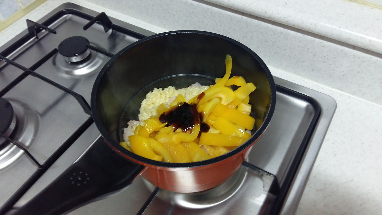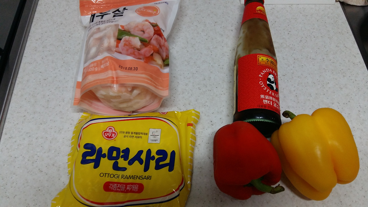새우, 라면사리, 굴소스, 파프리카, 간장조금