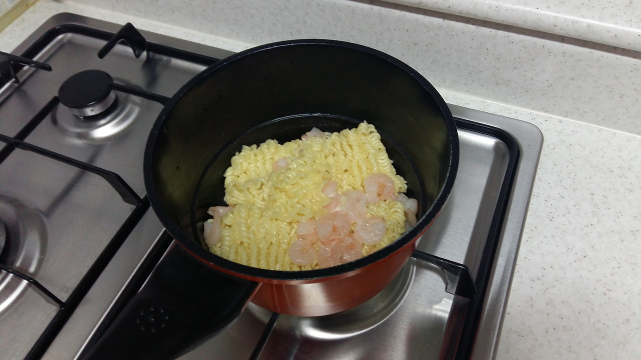 라면이랑 새우를 먼저 삶아줍니다.