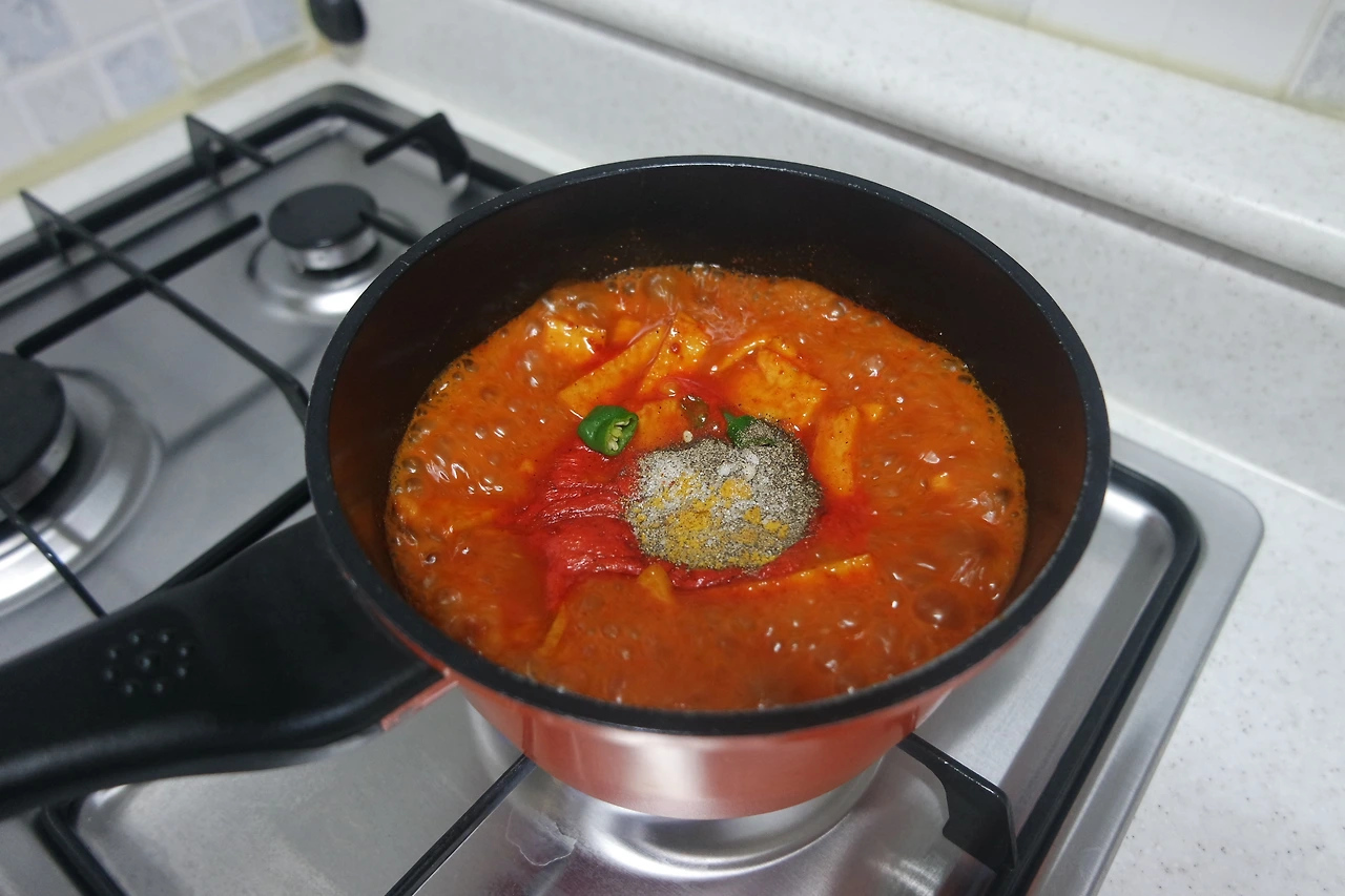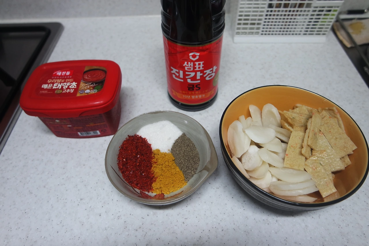 카레가루 3숟갈, 설탕 4숟갈, 고춧가루 2숟갈, 후추 1숟갈, 간장 2숟갈, 고추장 5숟갈, 디포리, 떡, 어묵 (양념은 자극적인 거 안 좋아하시면 2/3정도만 넣으세요)
