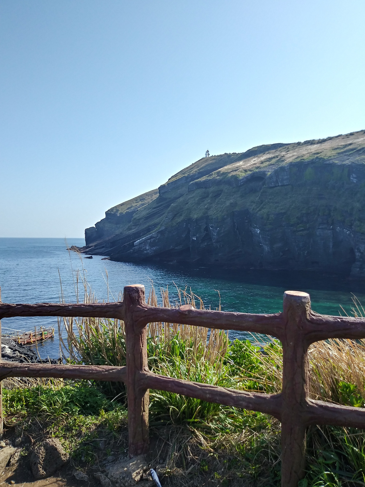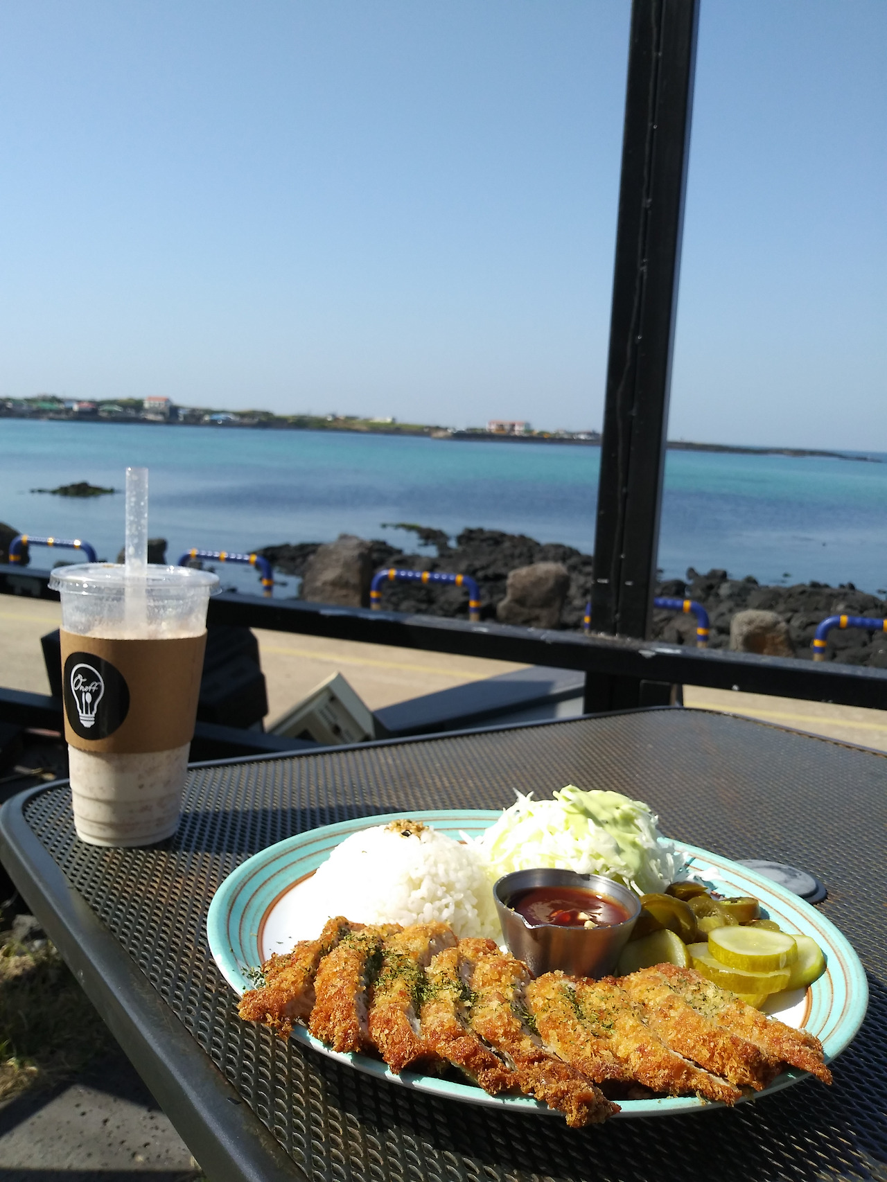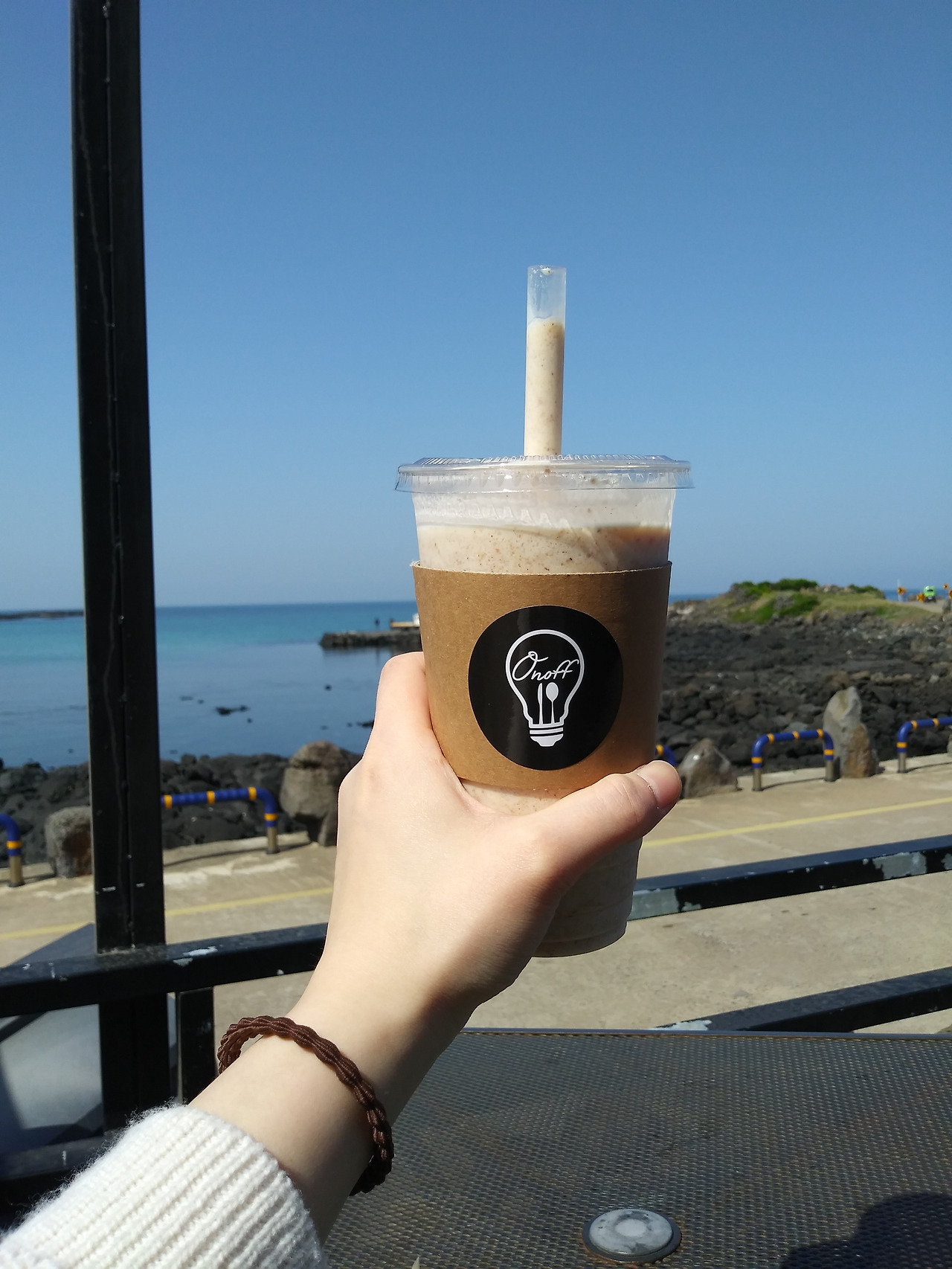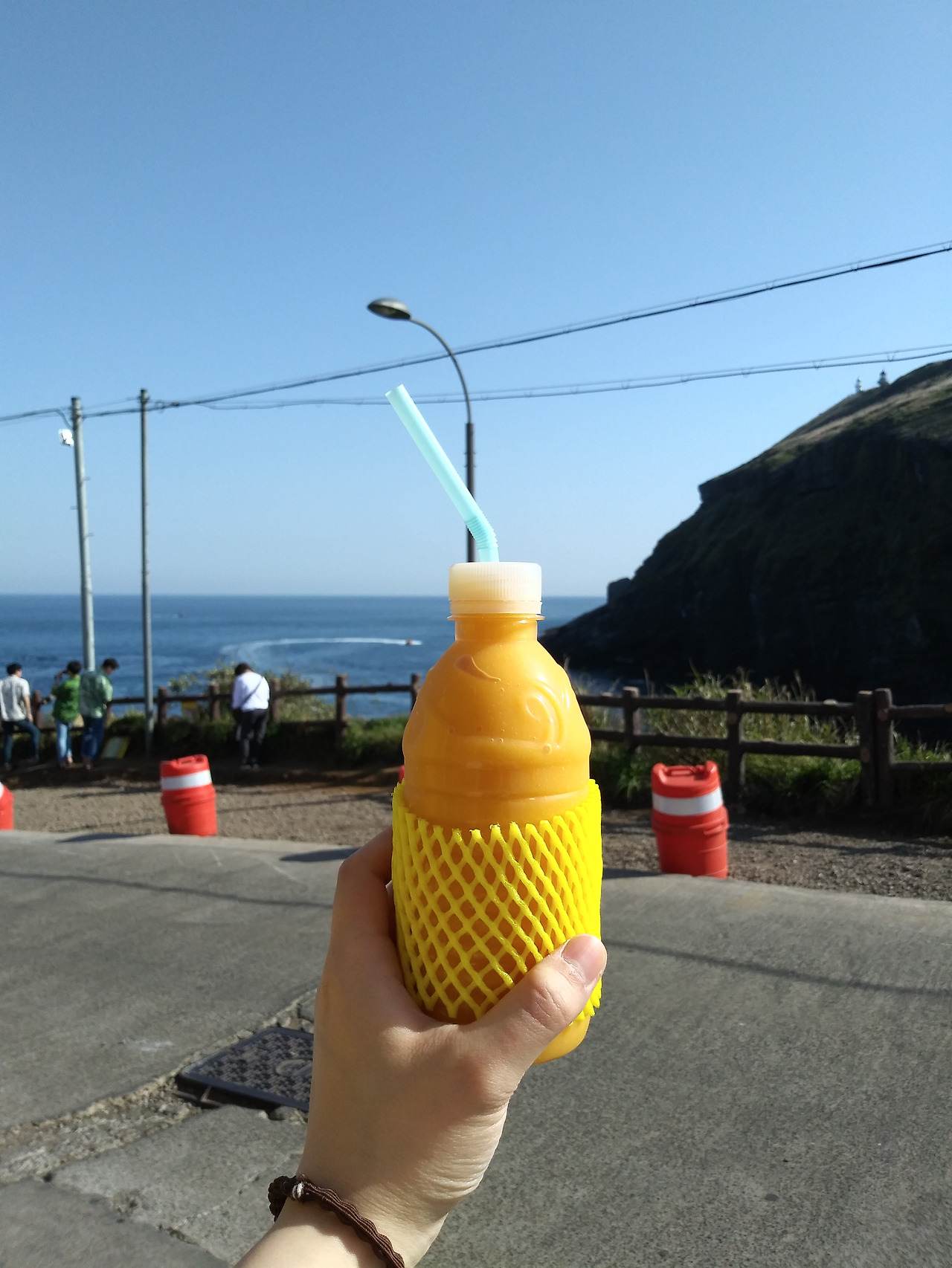 버스 타고 나오는 길에 말도 보고. 그리고 버스 타면 기사님이 지나가면서 보이는 것들 설명해주시는데 그게 참 좋았습니다. 이제 5시 배 타고 나오는 길. 나오는 배는 보통 6시가 마지막인 거 같아요. 겨울철은 좀 더 짧고. 그냥 가기 아쉬워서 섭지코지로 가서 인더오조라는 카페에서 당근케이크랑 한라봉에이드. 맛있고 뷰도 좋은데 물 빠질 때 가서 아쉬웠어요.
