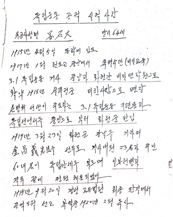 그것은 바로 '독립운동 공적 실적사항서'이다. 이는 1977년, 할아버지께서 강석대 독립운동가의 독립운동 공적 사항을 입증하기 위해 작성하신 자료로, 국가보훈처에 제출하신 것으로 알고 있다.