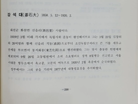 강석대 독립운동가께서는 강원도 화천군에서 활동하시기도 했고, 전국 단위의 독립운동 도서에는 자료가 잘 나와있지 않아서 강원도 지역을 중심으로 편찬된 책 위주로 찾아보았다.