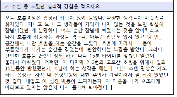 "마음챙김 명상의 7가지 태도 중의 하나는 '지나치게 애쓰지 말라'인데 명상을 하면서 너무 애쓰신 거 같아요. 애쓰시게 되면 명상은 더 힘들어집니다. 아마 수련일지에 기록을 한다고 생각하시니 더 힘이 많이 들어가신 것 같네요. 명상에는 성공하고 실패가 존재하지 않습니다."