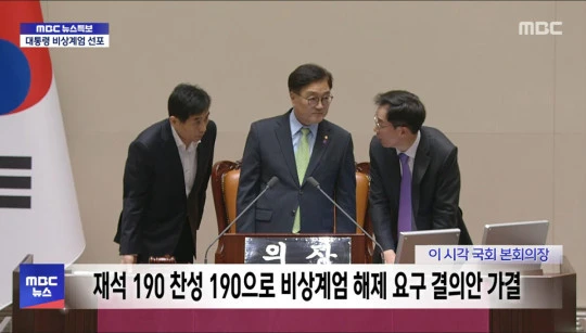 190명의 국회의원들이 모여 계엄 해제 결의안을 채택하게 되었다.