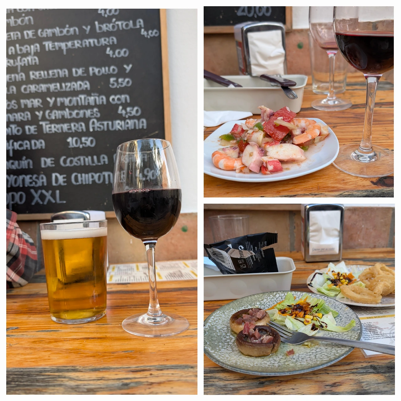 햇살이 남은 골목 한편 야외테이블에 앉아 타파스와 와인을 즐기며 세비야에서 첫 끼를 해결했다. 올리브 오일과 허브 향이 배어 있는 새우 한 점, 와인 한 모금이 입안을 깔끔하게 정리해 주고, 골목에서 들려오는 낮은 웃음소리와 기타 소리를 배경음처럼 곁들였다. 세비야의 첫날을 느긋하게 마무리하는 순간이었다.