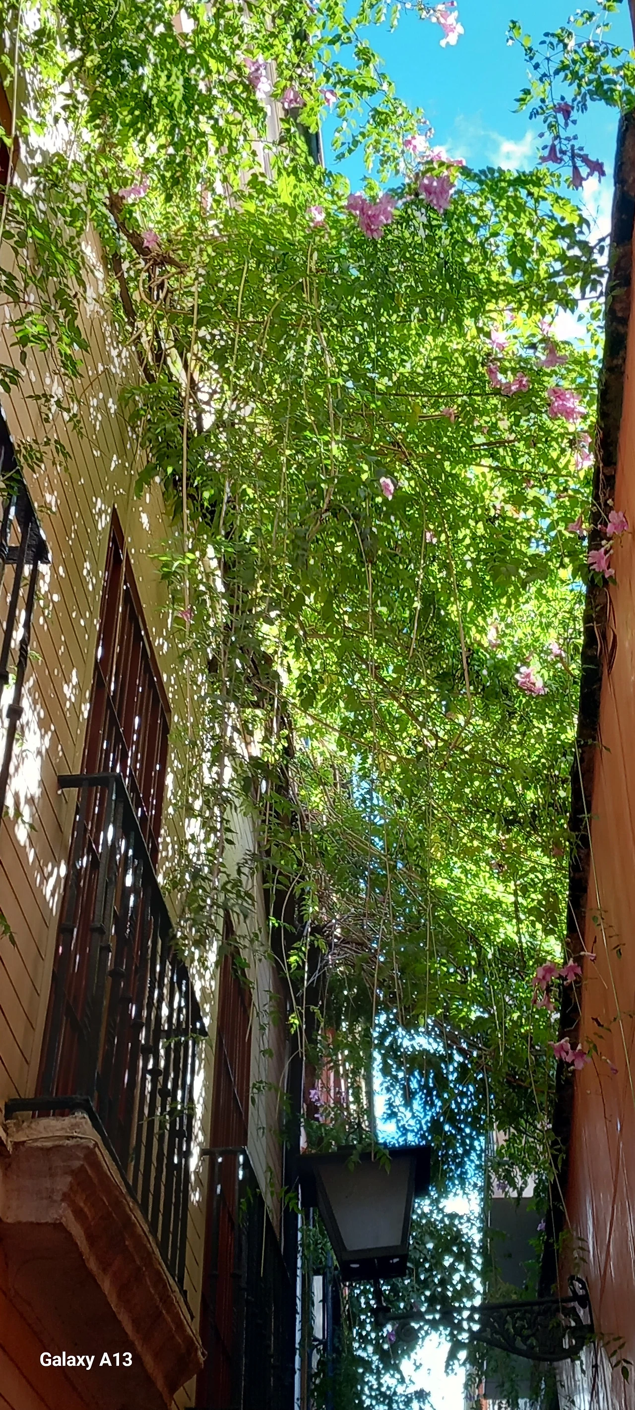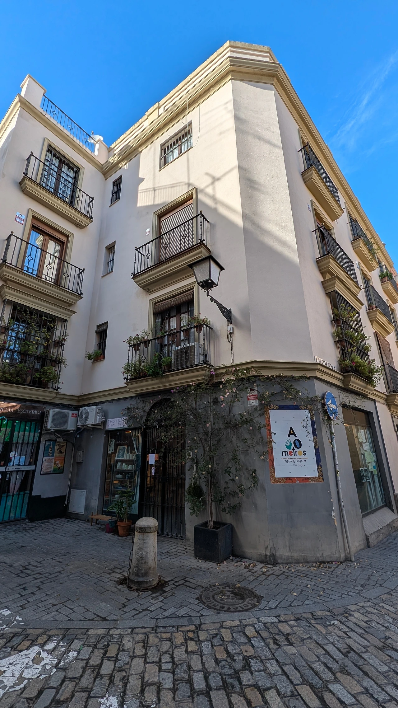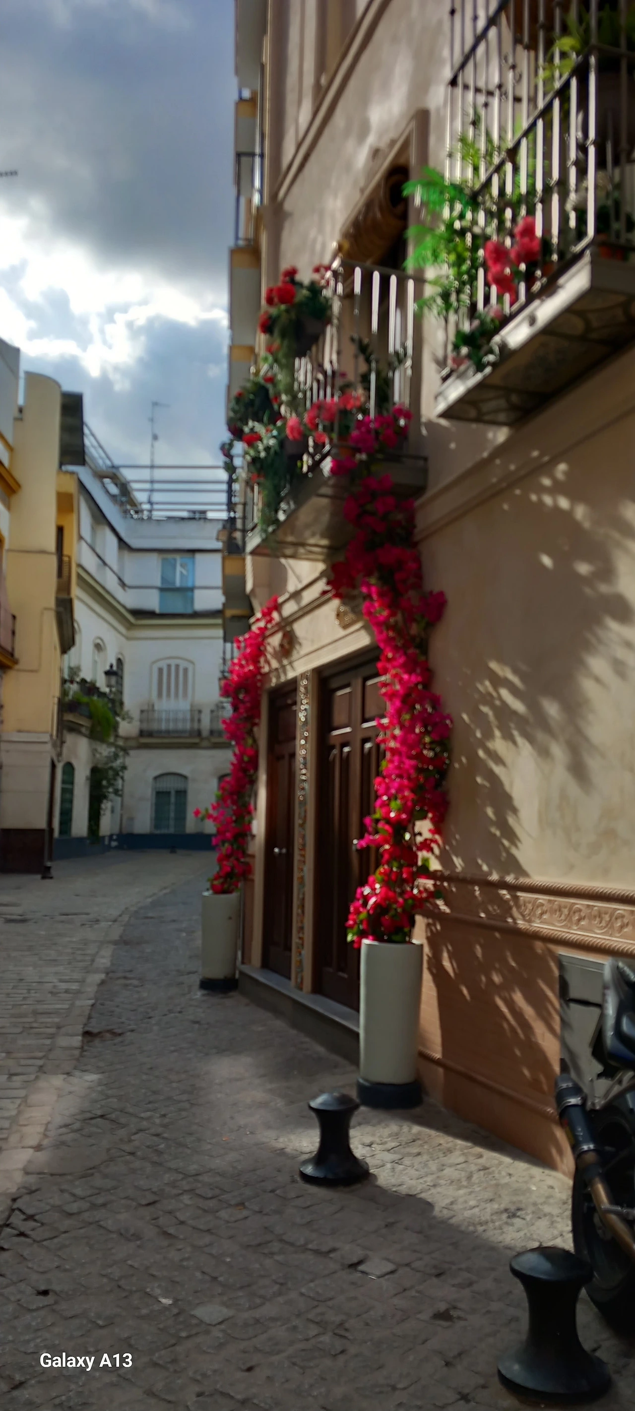 두 손을 펼치면 양쪽 벽이 닿을 듯 가까운 건물들이 이어지고, 머리 위로는 철제 발코니들이 겹겹이 포개져 있었다. 벽면은 햇살을 머금은 알베로(albero) 색과 흰빛이 자연스레 이어지며, 세비야 골목만의 부드러운 황금빛 공기를 품고 있었다. 짙은 나무문과 고풍스러운 창살이 이어져, 오래된 골목 미로 속으로 자연스레 들어서는 느낌이었다. 택시는 좁은 골목을 누비며 어느 광장 옆 골목 어귀에 내려주고, “여기 근처일 겁니다.”라는 말을 남긴 채 유유히 골목 속으로 사라졌다.