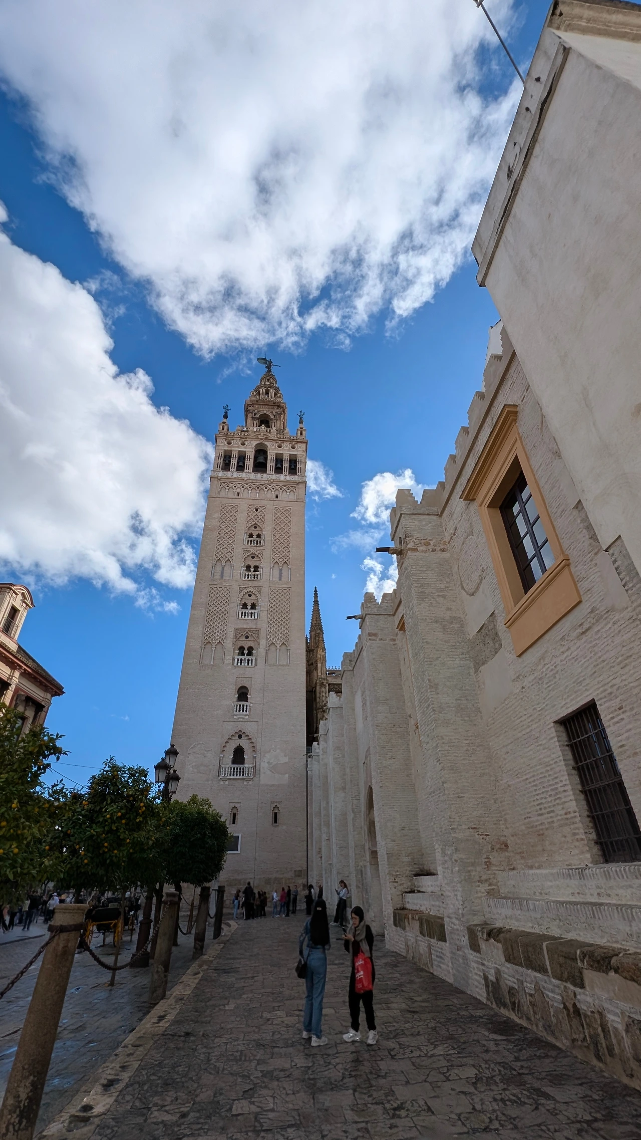 그렇게 좁은 골목을 한참 돌다, 문득 골목 너머로 세비야 대성당의 탑이 우뚝 솟아 있는 것이 보였다. 모모는 스마트폰을 들여다보며 길을 재확인했지만, 탑을 발견하자 표정이 살짝 밝아졌다. 탑이 있는 방향으로 우리는 자연스럽게 걸음을 옮겼다.