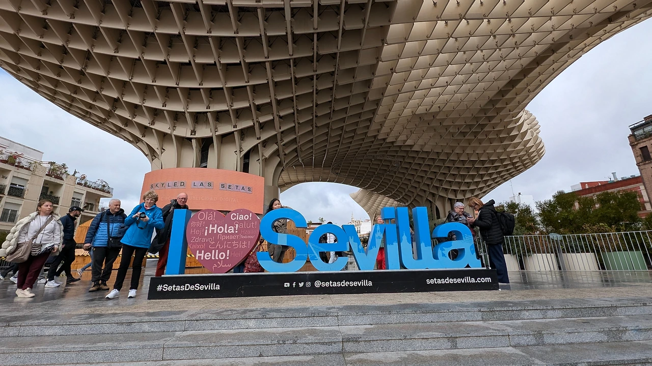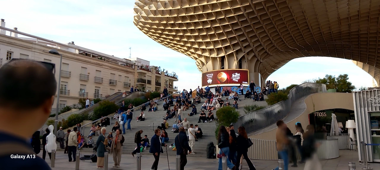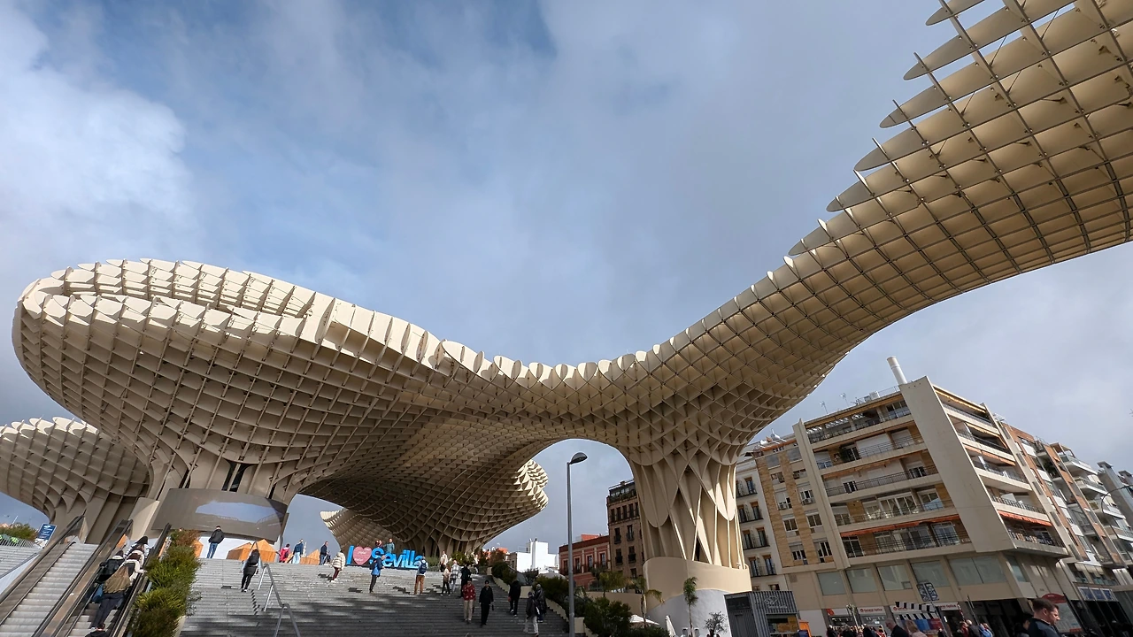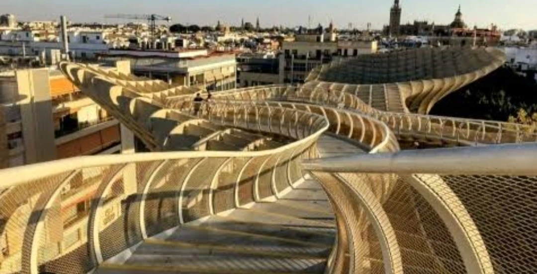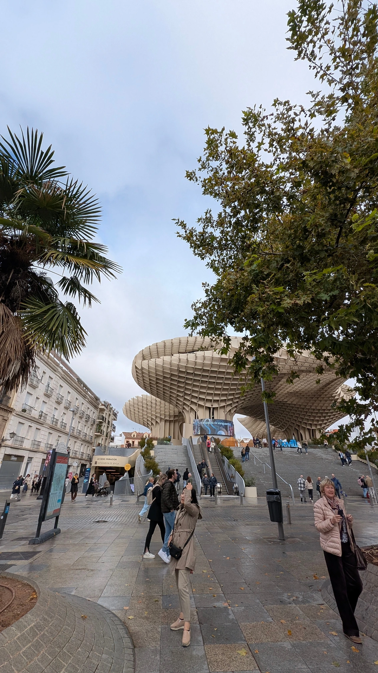 세타스 데 세비야(Setas de Sevilla), 공식 명칭 메트로폴 파라솔(Metropol Parasol)은 도심 한가운데 우뚝 선 대형 목조 구조물이다. 나뭇결이 드러난 지붕은 광장을 넓게 덮어, 비가 갠 뒤 흐릿한 햇살이 자연스럽게 아래로 스며든다. 사람들은 계단에 앉아 쉬거나 사진을 찍으며 여유를 즐기고, 아래층 시장과 상점에서는 커피 향과 기타소리, 알아들을 수 없는 스페인어가 뒤섞여 어우러져 활기찬 분위기를 만들어낸다.