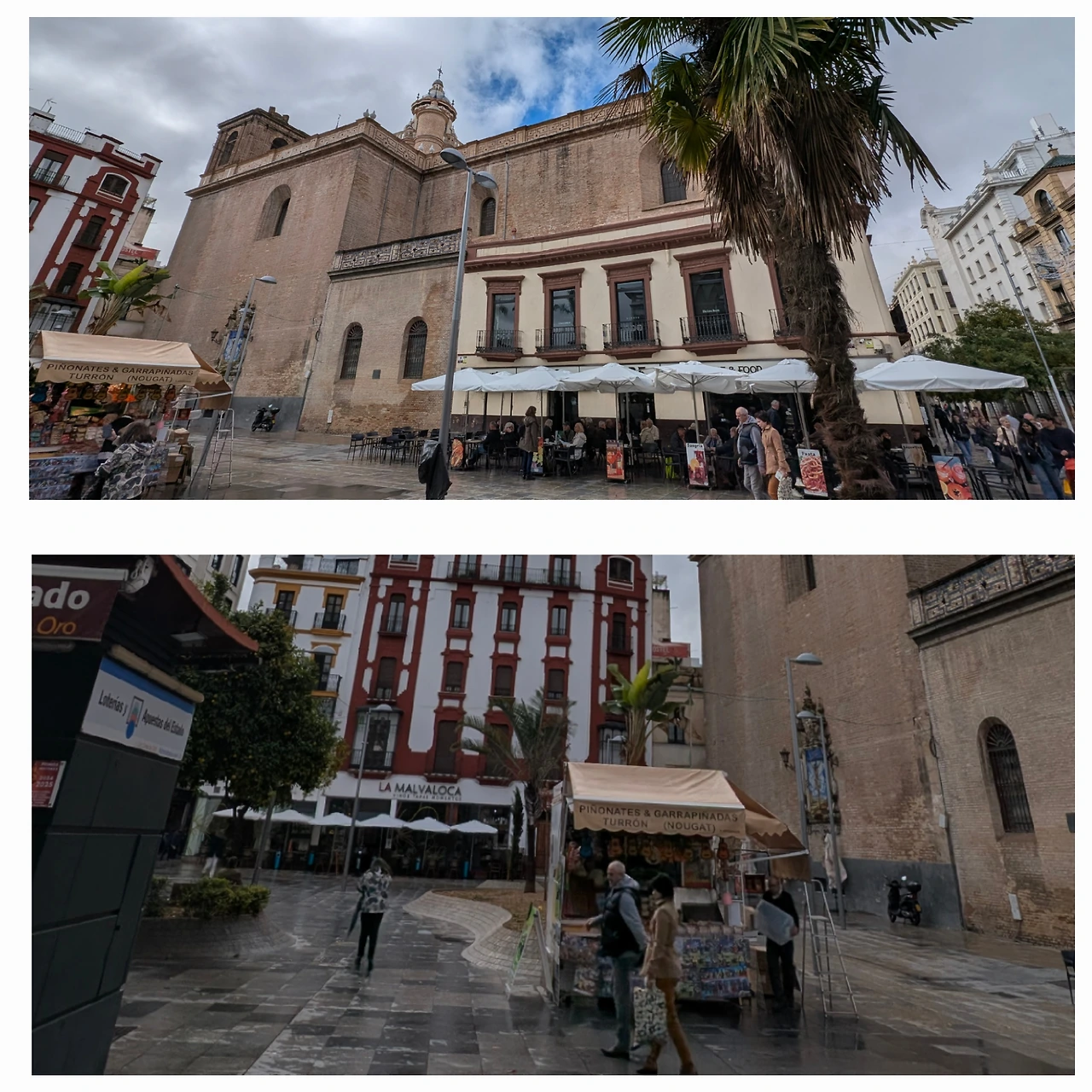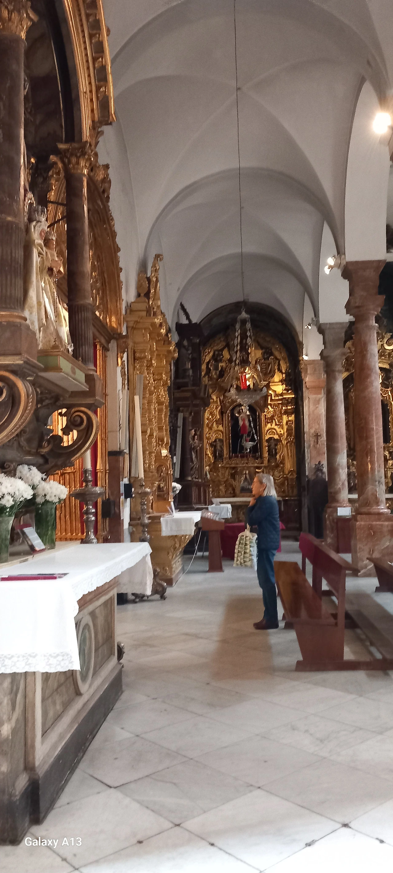 차츰 세비야의 골목길에 익숙해지고 있던 우리는 스스럼없이 아무 골목으로 들어섰다. 그곳에는 플라멩코 의상이 걸린 가게와 아기자기한 상점들이 늘어서 있었고, 길을 걷다 이름도 모르는 작은 성당을 발견해 자연스럽게 들어갔다. 대리석 아치 기둥과 황금빛 장식이 눈부시게 빛나는 교회였다.