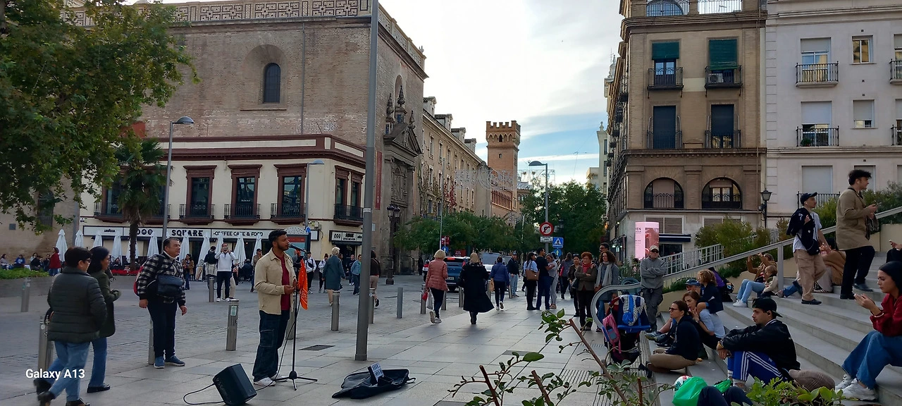 광장은 여전히 활기가 넘쳤고, 멀리서 노랫소리가 은은하게 들렸다. 소리를 따라가 보니, 대로변 계단 아래서 한 청년이 노래를 부르고 있었다. 맑게 갠 세비야 하늘 아래, 그의 목소리는 공기 속으로 가볍게 스며들었다. 사람들은 하나둘 귀를 기울였고, 한 곡이 끝나자 박수가 터졌다. 청년은 수줍게 미소 지었고, 울림은 광장을 하나의 악기처럼 채웠다. 우리도 그 소리에 이끌려 광장을 천천히 한 바퀴 더 걸었다.