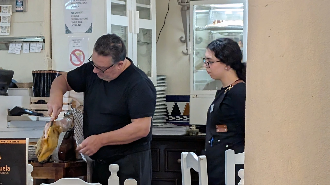 잠시 후 주방장은 하몽을 들고 와 맞은편 테이블에서 꽃잎을 떨구듯 한 조각씩 자르기 시작했다. 칼이 고기 결을 따라 스르륵 미끄러질 때마다 얇게 떨어지는 하몽의 향이 오감을 자극했다. 그는 은근히 자신의 칼솜씨를 자랑하는 듯했고, 주고받는 농담 속에서 저녁은 자연스럽게 이어졌다.