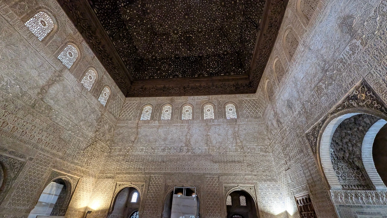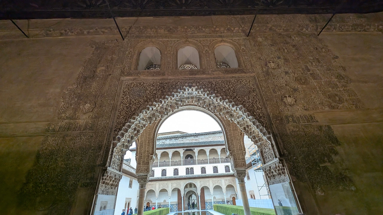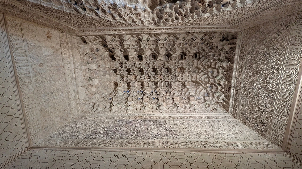 아치 위의 조각들은 레이스 커튼처럼 가볍고 부드러워, 숨결만 스쳐도 흩날릴 것 같았다. 조각 위로 스며든 빛은 벽을 타고 천천히 흘러내렸고, 문양의 깊이를 따라 그림자를 만들었다가 다시 사라졌다. 안뜰에서는 물이 낮은 소리로 흐르고 있었고, 그 물소리는 이 화려한 공간을 이상할 만큼 차분하게 만들었다.