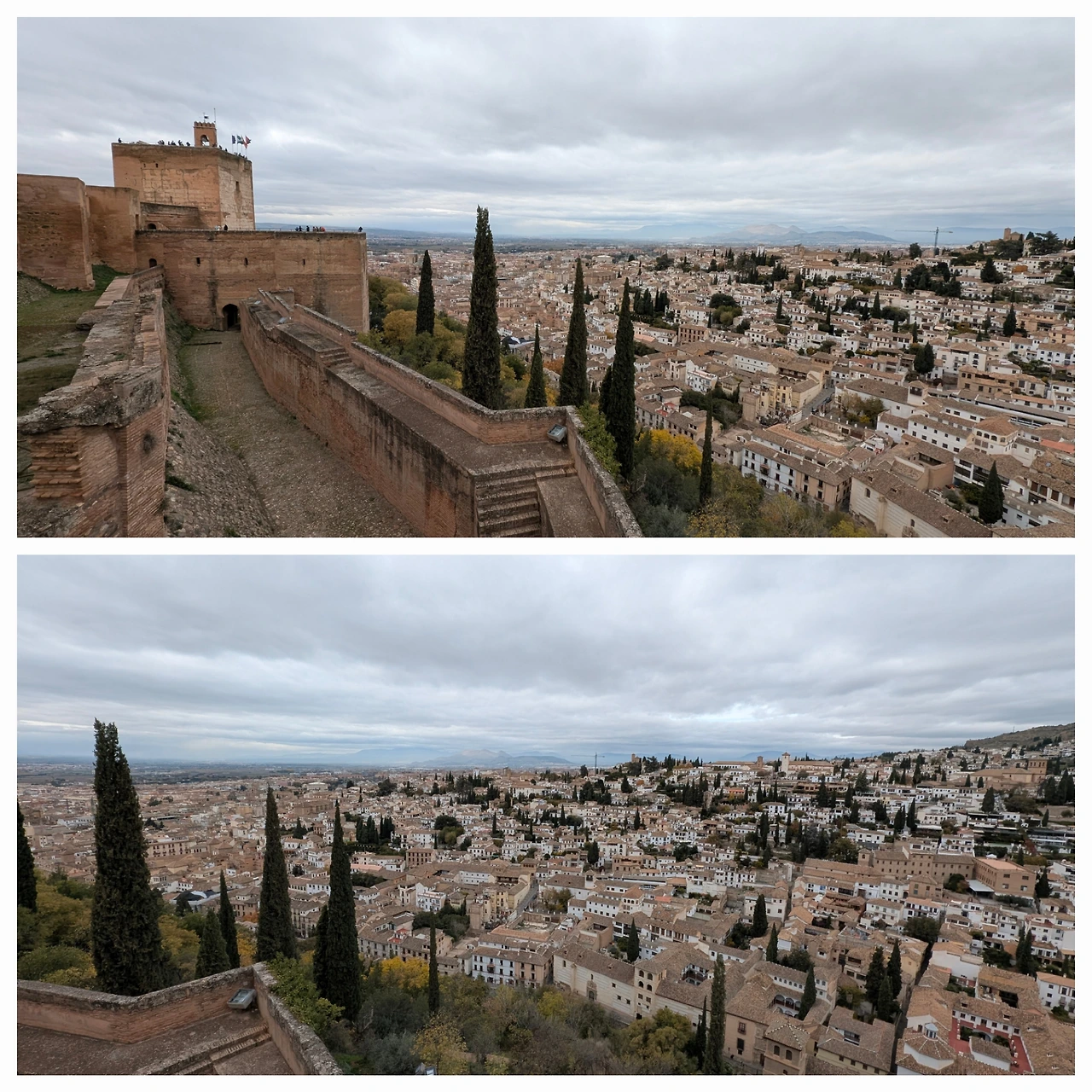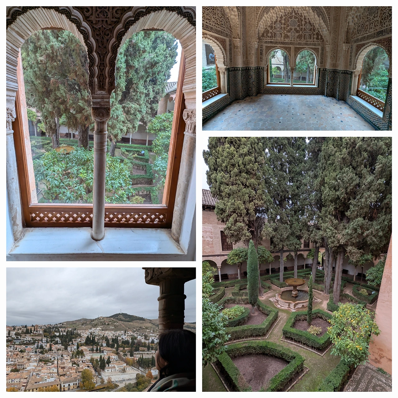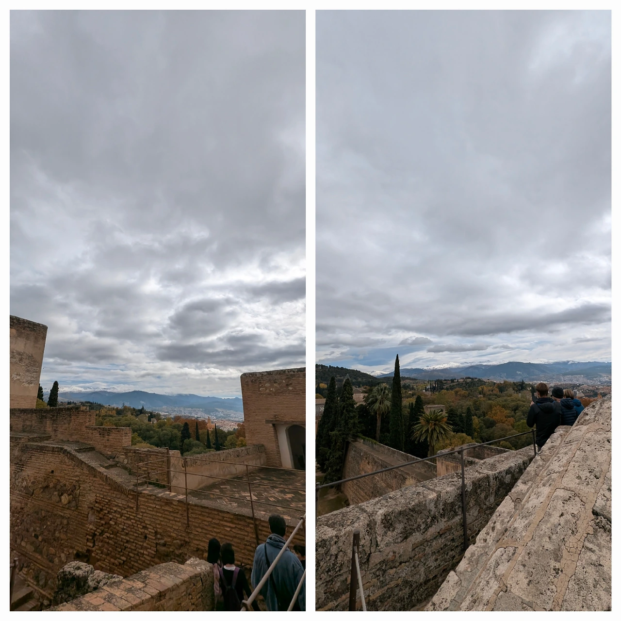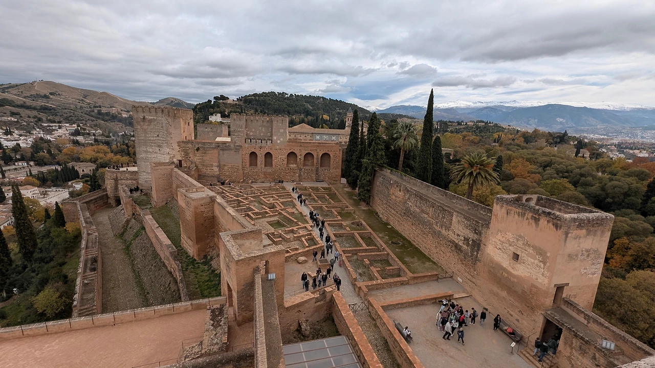 성곽 사이로 이어진 언덕과 올리브 나무, 주변 숲의 녹색은 붉은 벽과 극적인 대비를 이루며 도시의 붉은 지붕들과 어우러졌다. 멀리 시에라 네바다 산맥은 초겨울 햇살 아래 온통 하얀 눈으로 덮여, 알함브라와 도시를 포근히 감싸는 배경이 되었다.