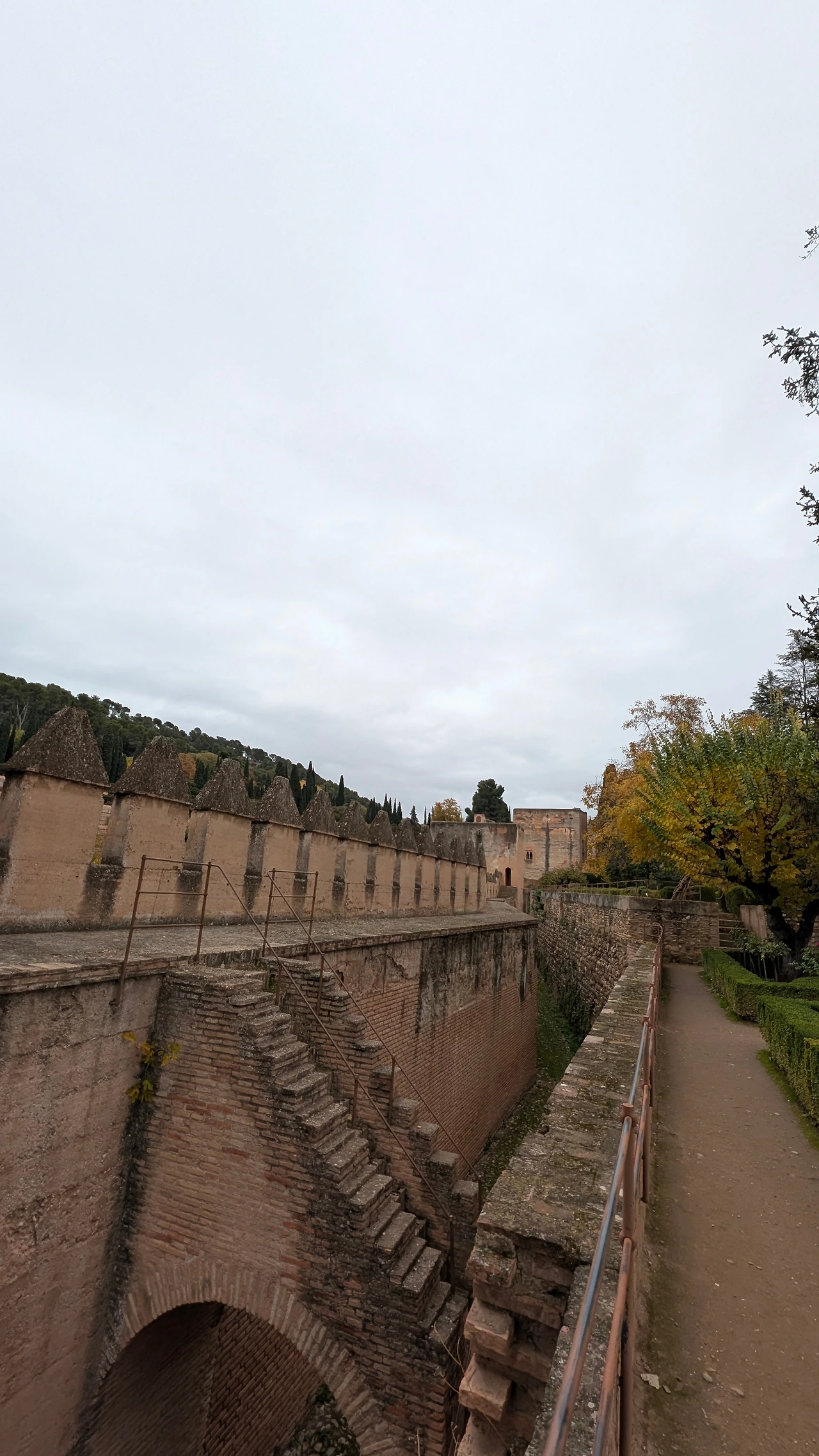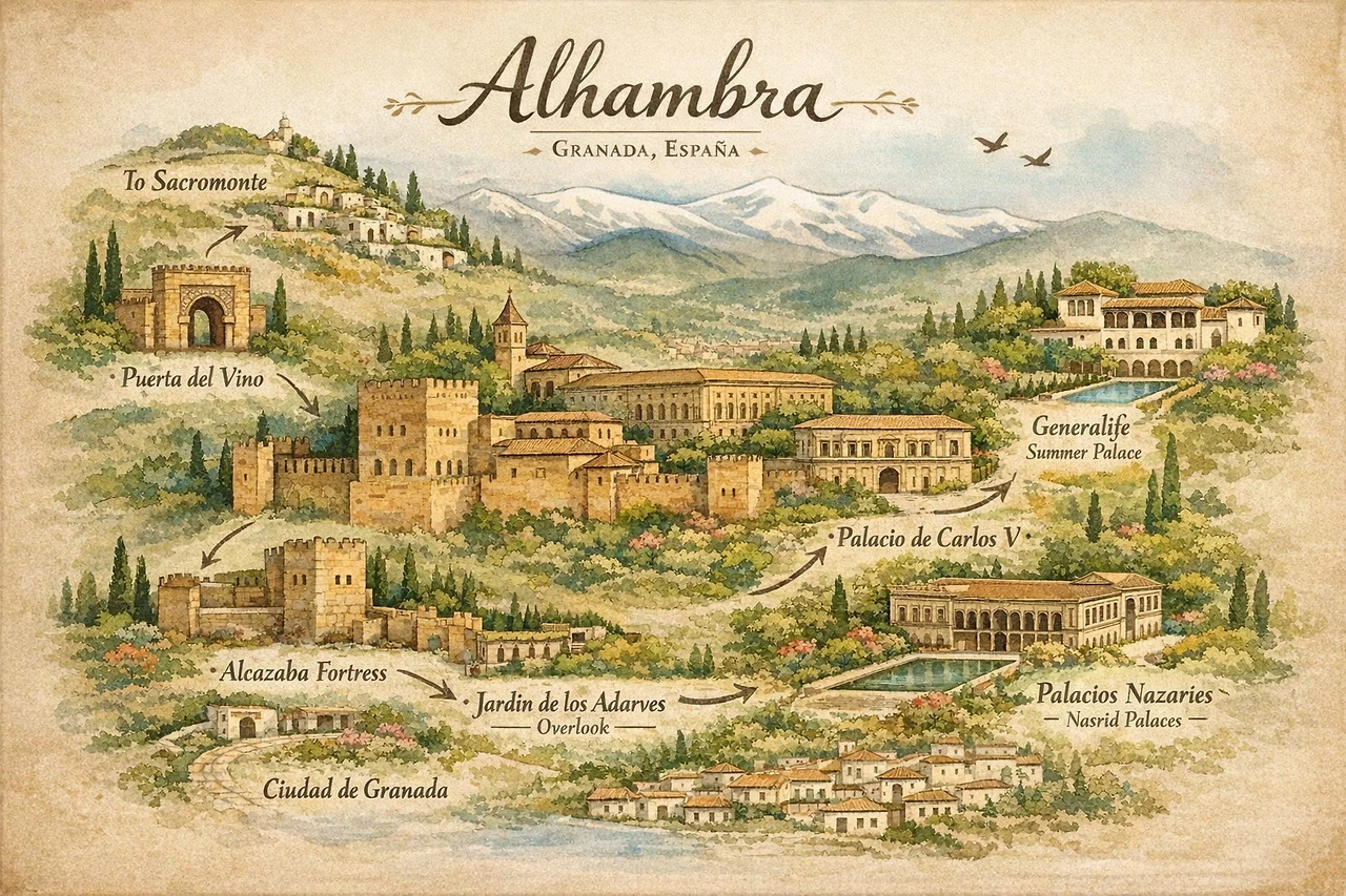 입구에서 티켓과 여권을 확인하고 들어서자, 13세기 나사르 왕조가 남긴 정치와 예술, 방어가 조화를 이룬 복합 공간이 펼쳐졌다. 숲길과 산책로는 사이프러스와 올리브 나무 사이로 이어졌고, 햇살은 나뭇잎을 통과해 바닥 위에 부드럽게 내려앉았다.