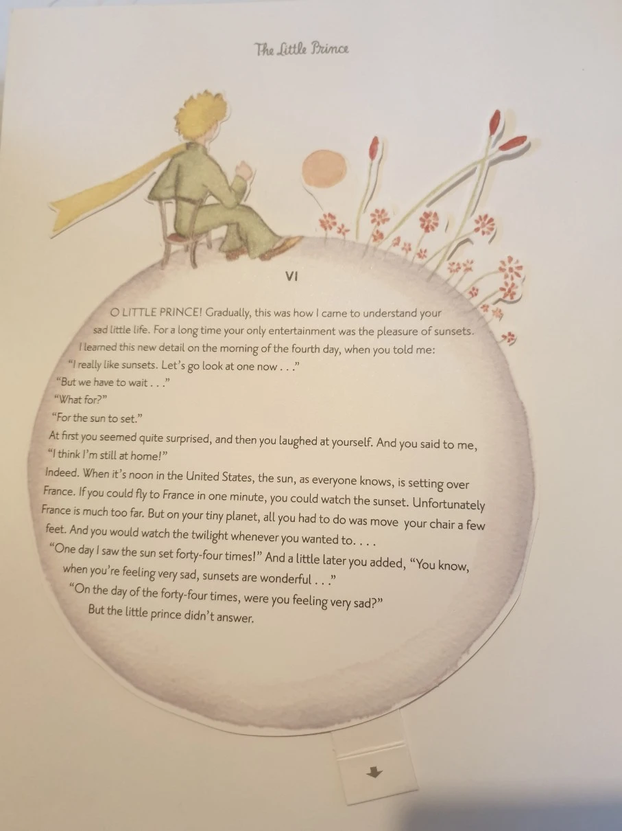 [네 작은 별에서는, 네 작은 의자를 조금만 옮기는 것으로도 충분했을 테지, 그래서 너는 내가 원할 때면 언제든 석양을 볼 수 있을 테고, "어느 날 해가 지는걸 마흔네 번이나 봤어!" 그리고 조금 후에 너는 덧붙였지. "있잖아... 너무 슬픈 때는 누구라도 해 지는 석양이 좋아져......" "마흔네 번 그걸 보던 날 그러니까 너는 너무 슬펐던 거니?" 하지만 어린 왕자는 아무런 대답이 없었다.]