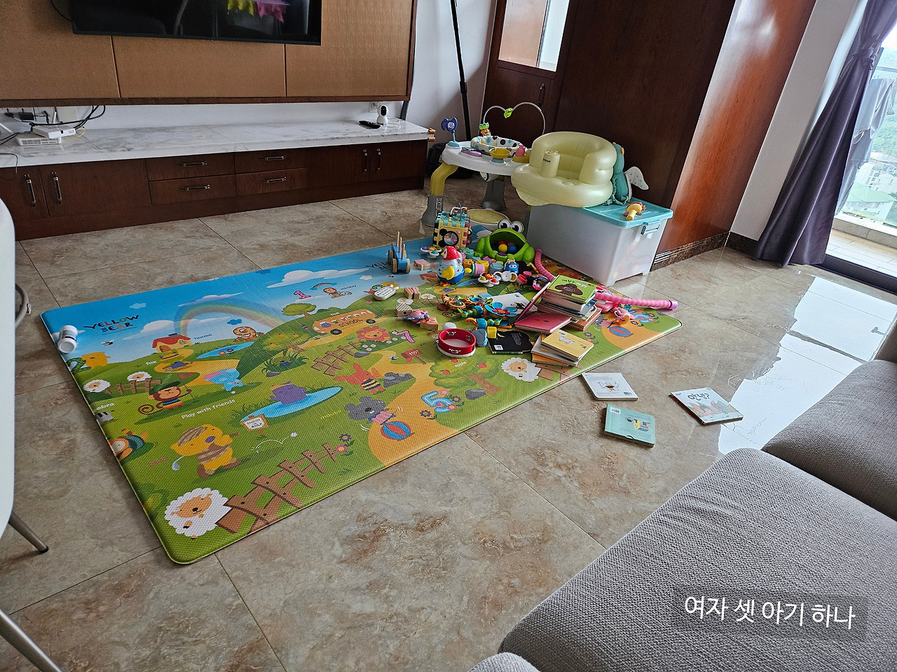 아기 장난감들, 소파와 식탁이 있는 거실은 사실 아기 매트를 밟지 않고서 지나가기 어려울 정도로 비좁은 편이었다.