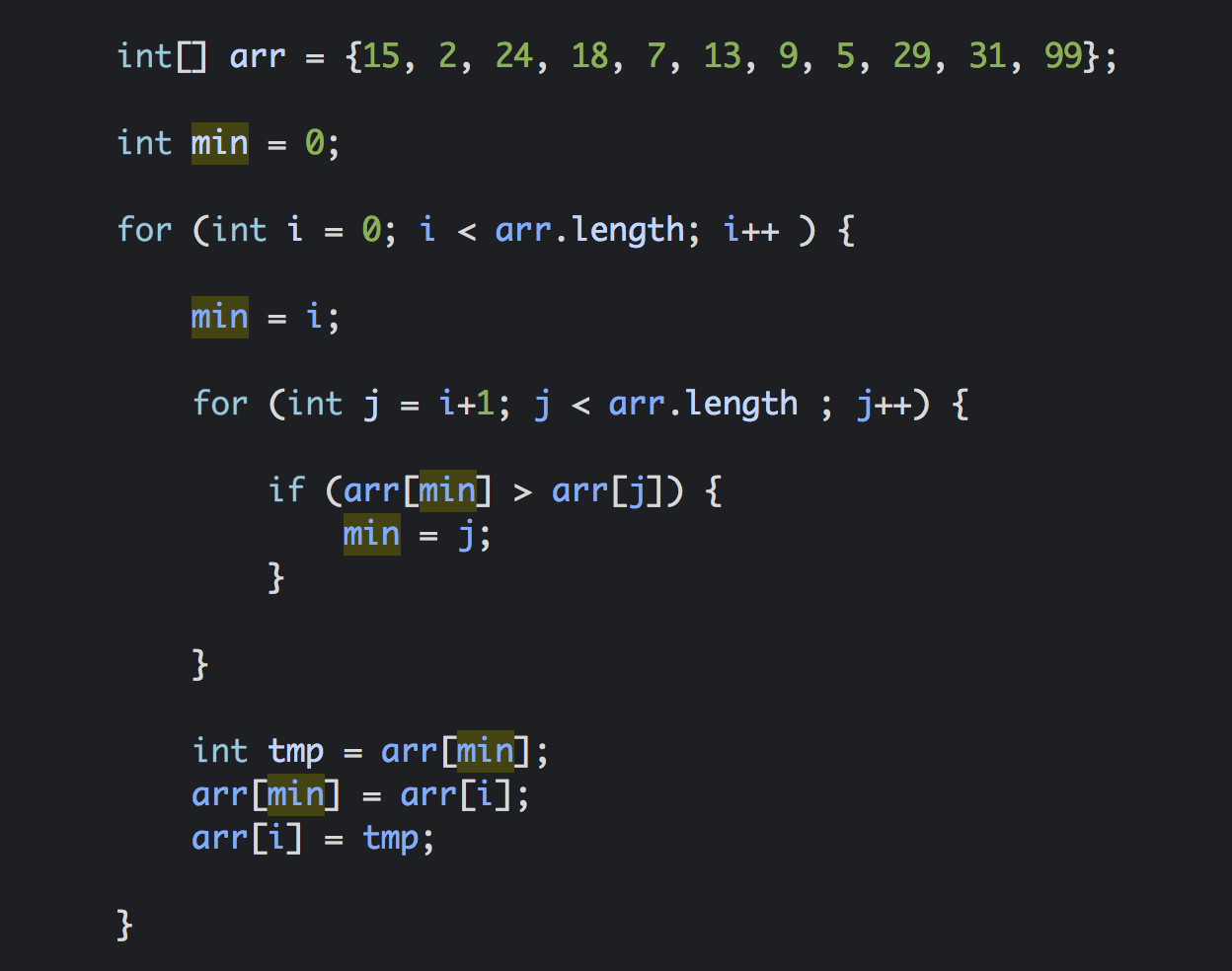arr[0]의 값을 넣을 때 전체의 최소값을 찾고 arr[0]과 값을 바꿔준다.