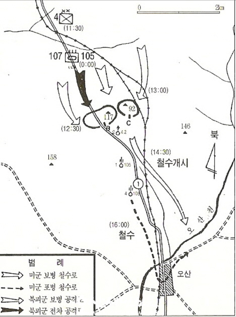오전 7시 30분: 빗속을 뚫고 지축을 흔드는 굉음과 함께 북한군 제4사단 소속 T-34 전차 8대가 모습을 드러냈습니다. 미군 포병대가 105mm 곡사포를 발사했지만, 일반 포탄은 전차의 장갑에 아무런 흠집도 내지 못했습니다.