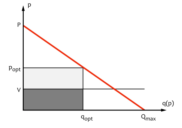 그래프 아래 우측 구석구석 여기서도 팔리고(=싼데 더 많이 or 좀 덜싼데 더 적게 팔기도), 그래프 y축 위쪽 (비싼데 더 많이 혹은 더 적게)도 팔리고, 쪼개고 쪼개고~ 작게 작게~ 더 잦은 거래가 성사되면, 총 팔리는 매출액의 전체 크기가 max에 가까워지는데.