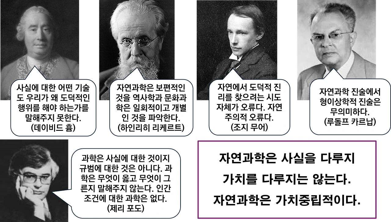 근대 이후 과학은 '사실과 가치의 분리'를 이상으로 삼았다. 데이비드 흄(David Hume)은 "사실에 대한 어떤 기술도 우리가 왜 도덕적인 행위를 해야 하는가를 말해주지 못한다"라고 주장했다. 조지 무어(G. E. Moore)는 자연에서 도덕적 진리를 찾으려는 시도 자체가 오류라며 '자연주의적 오류(naturalistic fallacy)'를 지적했다. 하인리히 리케르트(Heinrich J. Rickert)는 "자연과학은 보편적인 것을, 역사학과 문화과학은 일회적이고 개별적인 것을 파악한다."며 영역을 구분했다.
