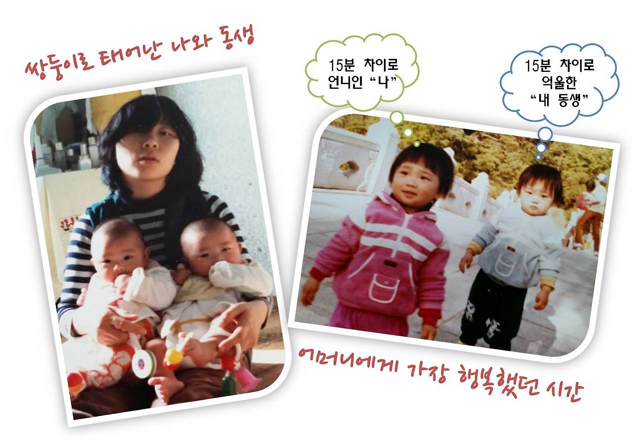 작년에 환갑을 훌쩍 넘기신 어머니께서 고이간직하시는 사진이 몇 장 있다. 바로 쌍둥이로 태어난 나와 내 동생의 어렸을 적 사진 들이다... 어머니께서는우리를 낳기 직전까지도 전혀 쌍둥이란 사실을 모르셨다고 했다. 그렇게 우린갑작스레 태어났고, 홀 시어머니의 고된 시집살이 속에서 맞벌이 부부이셨던 어머니는 홀로 새벽 4시에 일어나우리가 하루 종일 먹을 분유를 타서 준비해 놓으시고 아침식사를 차리고 출근을 하셨다고 했다. 그 당시 우리둘을 봐주시는 조건으로 집안 일은 커녕, 아무 것도 도와 주지 않으셨던 시어머니 덕분에 어머니께서는 택시도 흔치 않던 그 시절, 아픈 나를먼저 엎고 병원에 다녀 온 뒤, 누여 놓고 내 동생을 다시 들쳐 엎고 걸어서 병원을 두 번 씩 다녀오곤 하셨다고 했다.