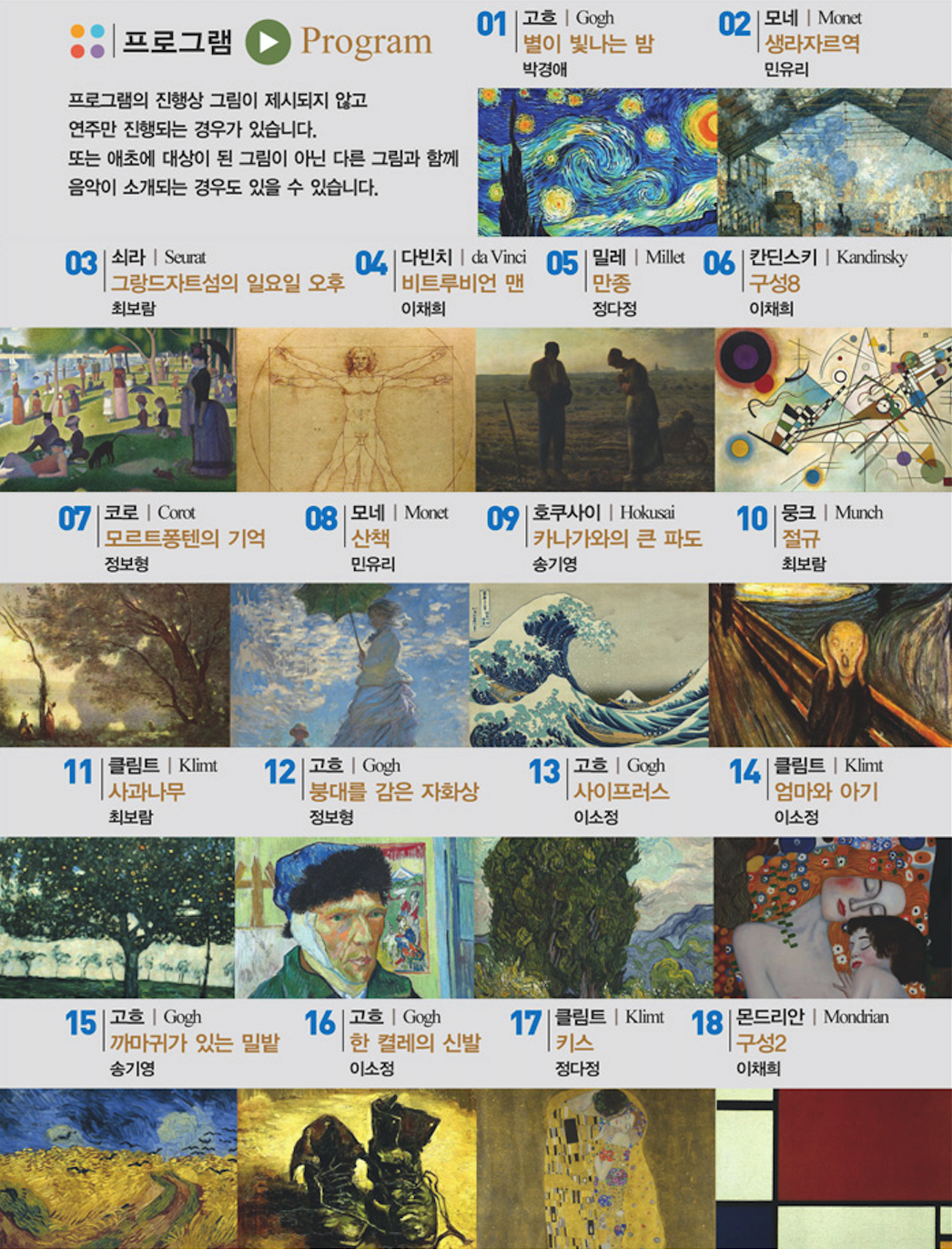 반 고흐의 일생이라는 서사적 구조의 틀 안에서 고개를 내미는 서정적 요소들은 하위징아의 표현을 빌리자면 아곤적(경쟁적)이다. 이러한 아곤적 요소들을 음악회가 어떻게 담아냈을지 궁금했다.
