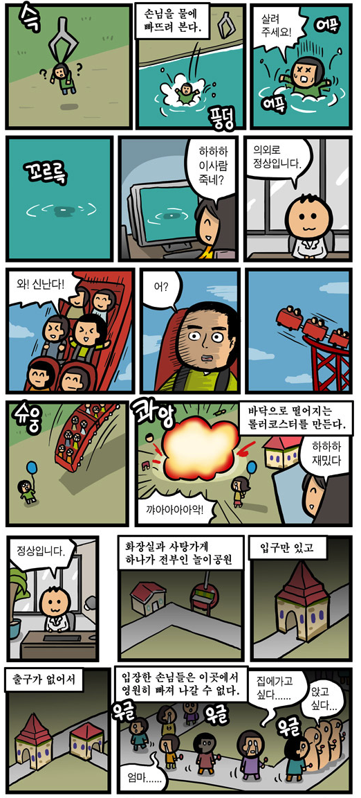 '롤러코스터 타이쿤'이라는 게임을 예로 들어보자. '롤러코스터 타이쿤'은 유저가 원하는 대로 놀이공원을 꾸미고 손님을 끌어들이는 시뮬레이션 게임이다. 사용자는 놀이공원에 놀이기구와 편의시설 등을 만들고 가상의 손님들이 이를 이용하는 것에 재미를 느끼도록 유도되었다. 참으로 아기자기한 게임이 아닐 수 없다. 하지만 유저들 중 몇몇은 게임사의 의도대로 플레이하지 않는다. 일례로, 263년 동안 놀이공원을 빠져나가지 못하도록 하는 미로를 설계한다든지, 일부러 추락하는 롤러코스터를 만들어서 손님들이 이용하도록 하는 사례 등이 무수히 많다.