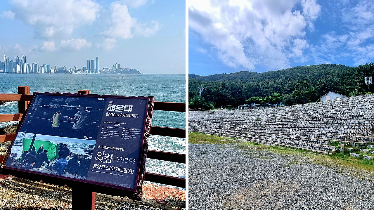 ‘해운대‘영화 촬영 장소 표시판 앞에 서서 지난날을 되돌아본다.
