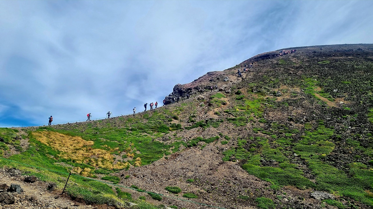 아침 5시, 호텔 앞에 모여 단체 사진을 찍고 이슬 머금은 길을 따라 아사히다케 로프웨이 탑승장으로 향했다. 상쾌한 아침 공기, 15도쯤 되는 시원한 기온, 옅은 구름 사이로 드러난 푸른 하늘.
