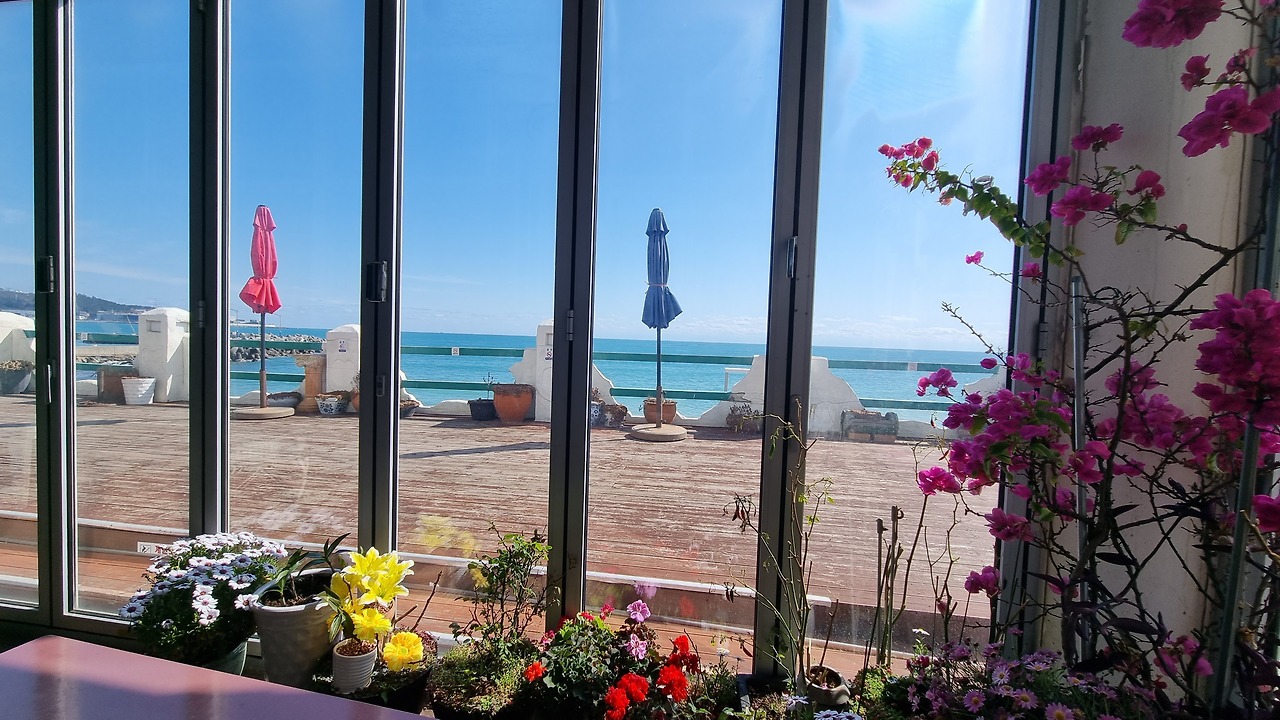 분위기를 살펴볼 겸 평일에 찾아가 보았다. 실내가 생각보다 넓었고 라이브 하기에 딱 좋았다. 아내와 바닷가 발코니 쪽 명당자리에 앉아 음악 들으며 바다 풍경을 가슴에 담았다.
