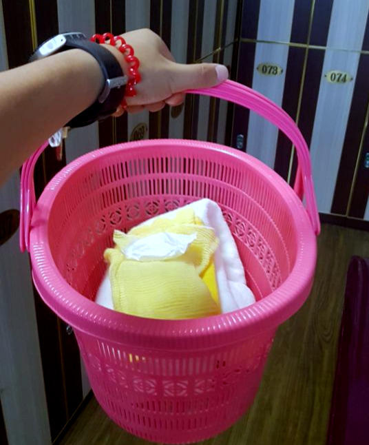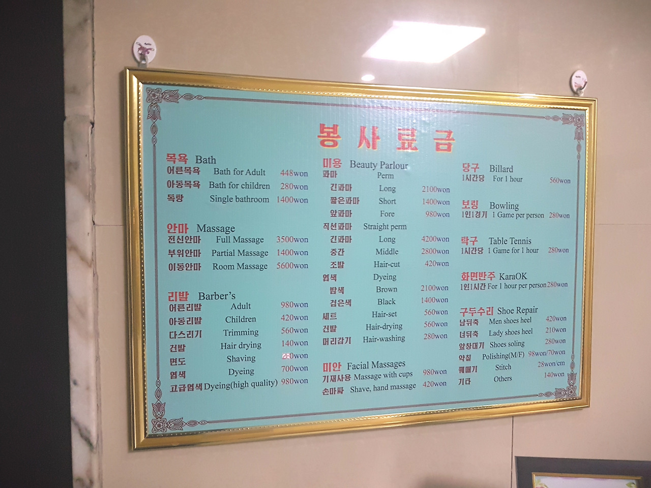 린민 호텔의 부대시설 봉사료금표'봉사료금'이라고 쓰여 있는 메뉴판에는 다채로운 서비스들이 적혀있었다. 계산대에서 돈을 내고 입장하니 분홍색 목욕 바구니에 수건과 비누 그리고 목욕 수건을 넣어 주었다.