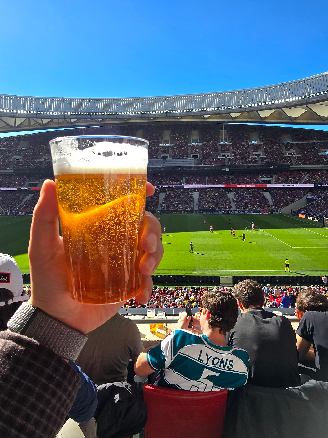 경기장은 지붕이 관중석을 덮고 있었지만, 위치에 따라 햇볕이 강하게 들어오는 곳도 있었다. 경기가 시작되고 마르코스 요렌테의 15분, 20분 연속 골로 AT 마드리드가 승기를 잡으며 전반을 마무리했다. 전반에 두 골이나 터진 경기를 즐겁게 보고 있던 중, 해가 넘어가면서 햇볕이 정면으로 내리쬐어 살이 타는 고통을 느끼게 되었다. 결국 시원한 맥주에도 견디지 못한 나는 47분에 터진 AT 마드리드의 세 번째 골을 보고 더위를 피해 라운지로 들어가야 했다.