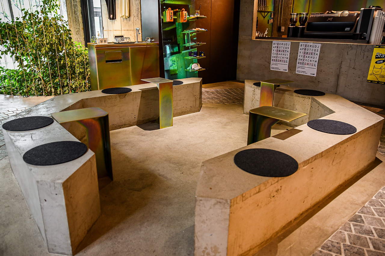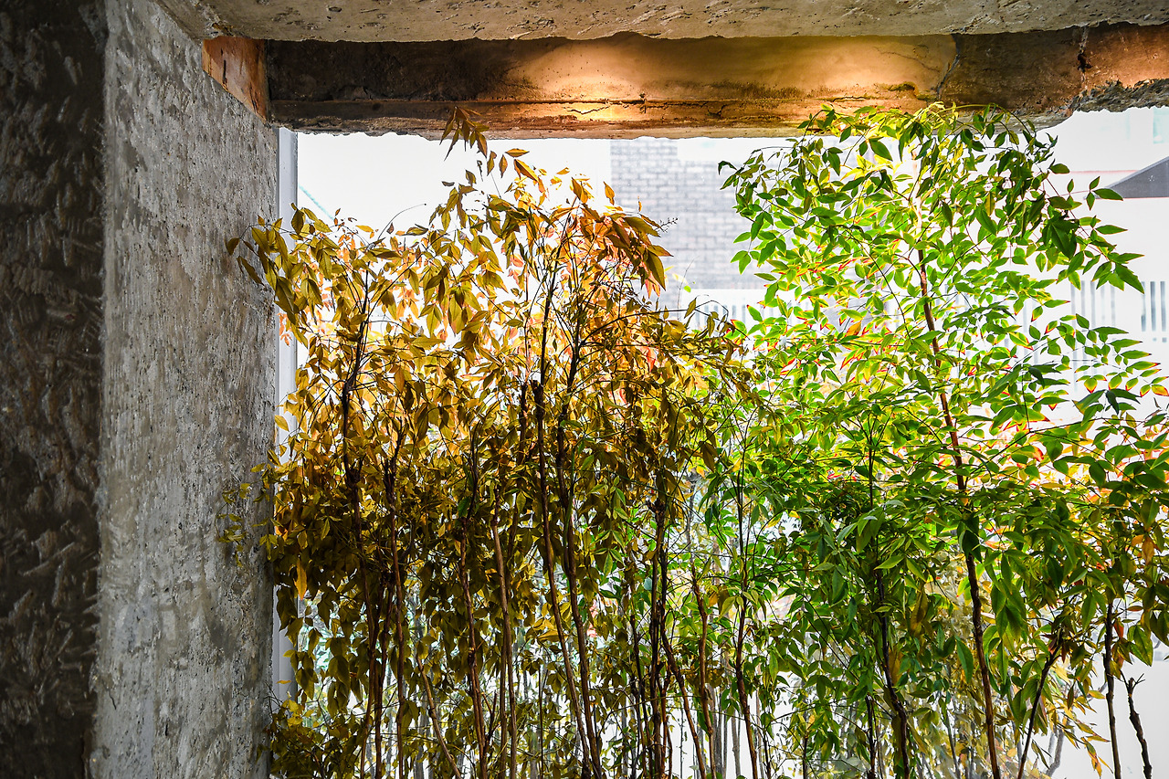 전체적인 공간의 톤은 따뜻하다. 보이는 것과 같이 차갑게 보일 수 있는 콘크리트와 석재들이 많이 배치되었지만 온난한 조명 빛을 품으며 보다 부드러운 인상을 갖게 된다. 하지만 날 것의 질감은 그대로 보존하여 본래의 매력을 감추지 않았다. 일반적인 노출 콘크리트 구조가 주는 느낌을 탈피하면서도 그 재질을 활용하며 식물과 어우러지는 것이다. 특히 자연광이 잘 들어오는 창가 쪽의 식물들은 초록, 노랑, 주황의 색으로 조명과 함께 톤을 맞추며 공간에 생명력을 불어넣는다. 크기는 작지만 무성한 잎사귀와 높이감이 있는 줄기의 모습은 어여쁘고 가녀린 감성보다는 활발함과 젊음을 상징하는 듯하다. 마치 작은 원시림이 현대적인 재료들과 어우러지며 새로운 공간으로 편입된 느낌이다.