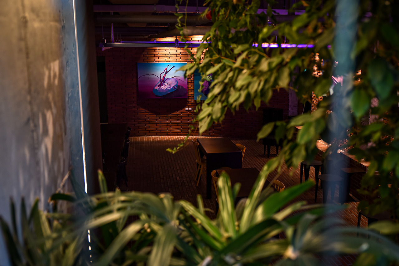 벽돌이 주는 분위기만이 전부는 아니었다. 이 공간의 기획자는 브라운 톤의 벽돌로만 가득 찬 지하 공간은 오색칠의 매력으로써 충분하지 않다고 판단했던 것 같다. 1층과는 다른 반전이 지하공간이었다면 그 공간 안에서도 반전이 되는 요소를 추가했다. 바로 조명이다. 내려오는 계단의 바로 밑쪽인 지하 공간은 전체적으로 넓은 형태인 홀과는 달리 약간 떨어져 다소 좁고 프라이빗한 느낌이 든다. 그곳에 큰 거울과 분홍&보라색 조명을 배치하였다. 방문한 사람들은 독특한 시각성에 끌려 자연스럽게 안쪽 모습을 들여다보게 된다.