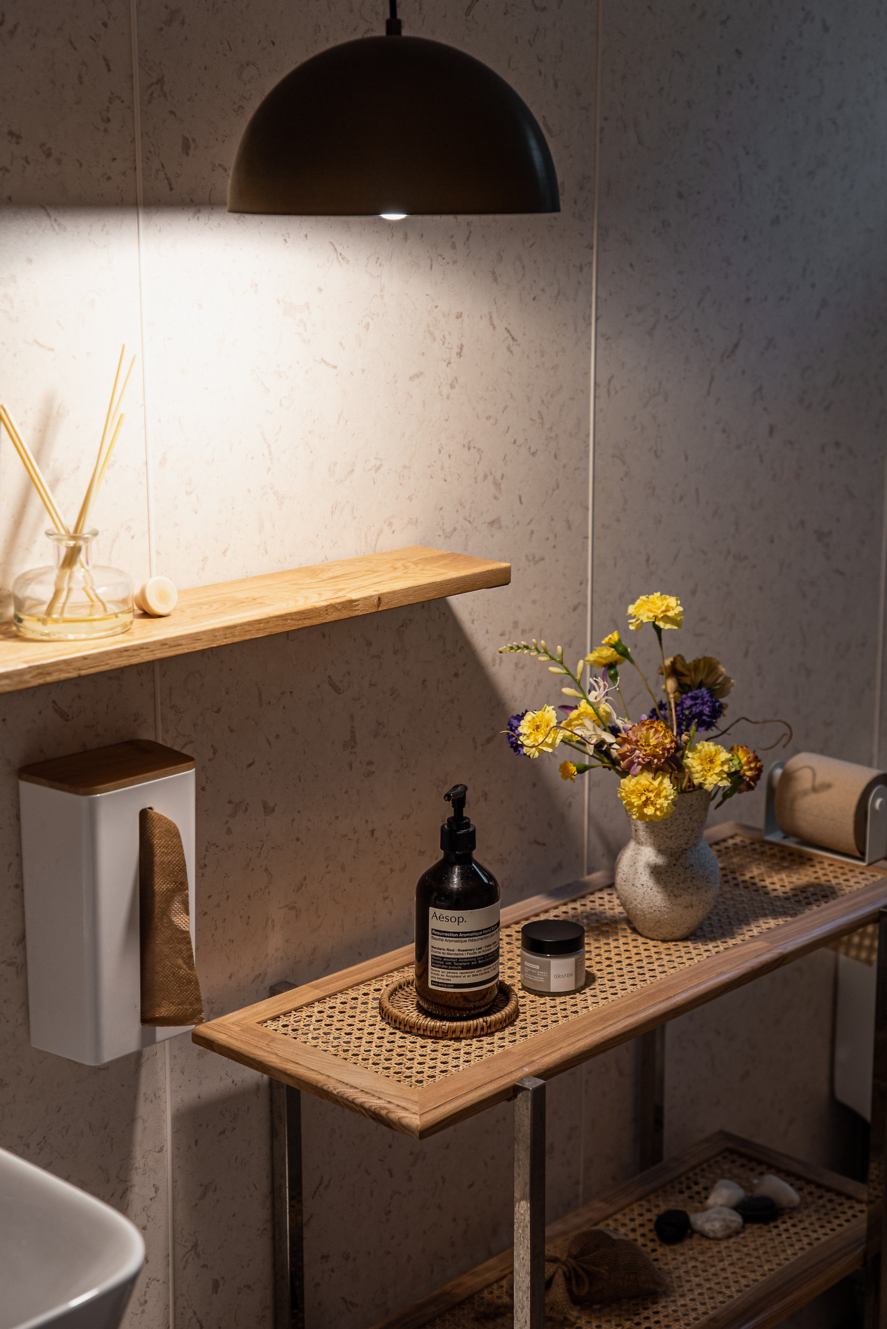 비어 보일 수 있는 공간의 구석에도 은은한 빛과 질감들을 채워 넣는다. 섬세한 손길이 감성의 밀도를 높인다.