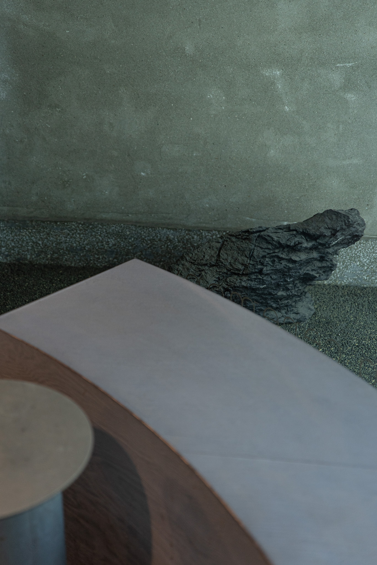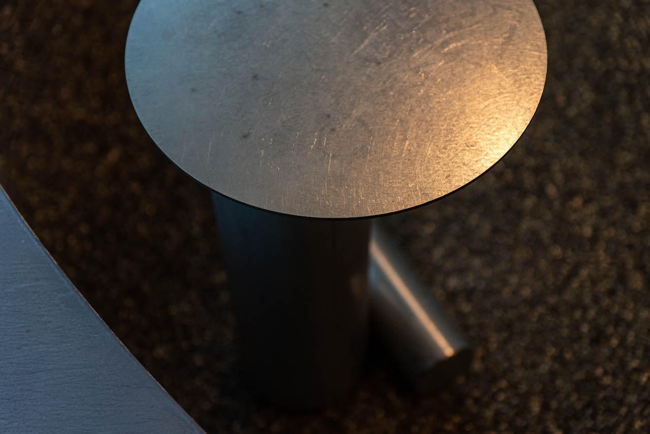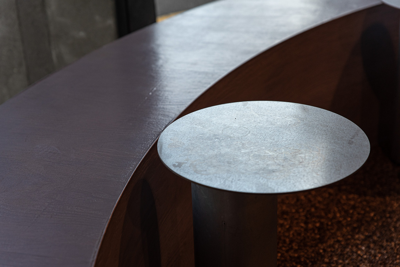 콘크리트, 철, 돌, 나무 4개의 재료들이 사용된 공간이다. 각 기물은 치장의 요소를 덜어내어 단순한 디자인과 깔끔한 단면이 드러난다. 반면 색깔의 구성이 독특한데, 푸른색과 회색 그리고 따뜻한 색의 조명이 오묘한 대비를 보인다. 앞서 보았던 하늘색 나무의 재질은 조명을 받아 그 모습이 더욱 낯설어진다. 하지만 전체적인 분위기는 거부감이 없으며 충분히 느낄 수 있는 개성으로 다가온다.