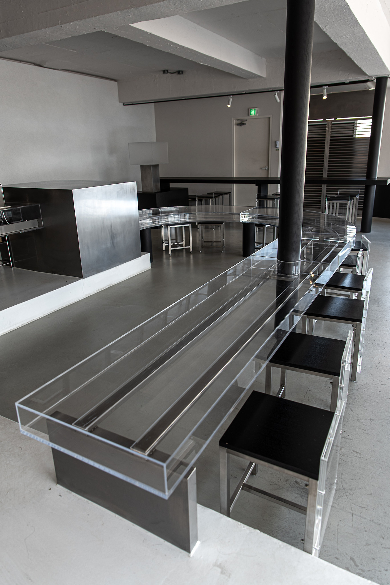 흑색이 갖는 무게감을 중심으로 무채색의 조합이 부드럽게 묻어나는 공간이다. 자연광은 환경에 따라 변화하며 은은함과 명확한 밝음을 오간다. 공간의 상부 구조를 이루는 천장과 벽면은 흰색 페인트로 차분한 톤을 맞추었다. 특히 스테인리스, 아크릴, 나무의 소재가 눈에 띈다. 각 기물들이 갖는 고유한 질감과 결이 빛을 받아 드러난다. 빛의 변화에 따라 우리의 시선을 사로잡는 섬세한 감각이다.