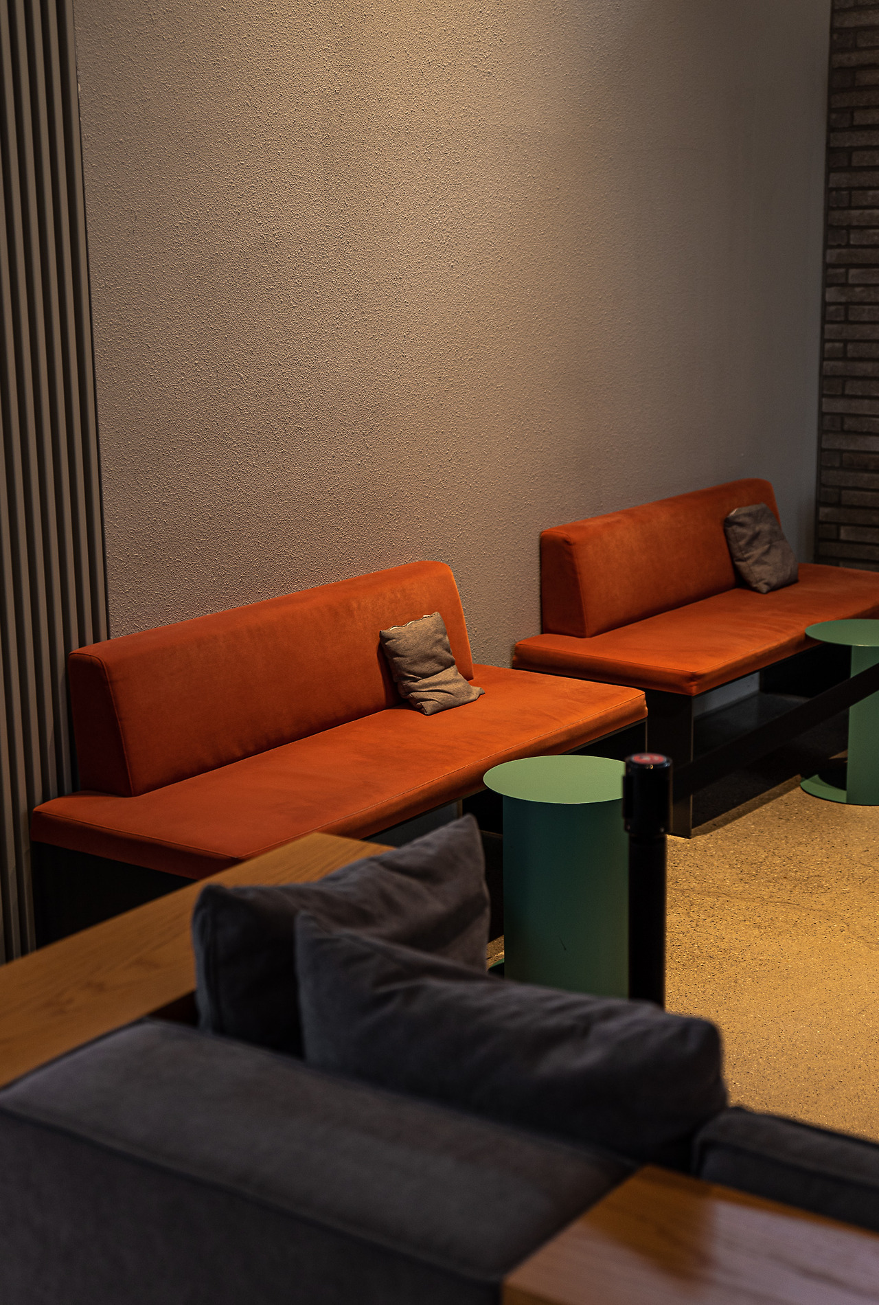 서울숲역을 나오자마자 보이는 주황색 간판과 안쪽으로 길게 뻗은 동선이 우리를 안내한다. 숨겨진 모습으로 인도하는 짧은 길은 거친 회색벽면으로 우리를 감싼다. 성수동의 공업적인 이미지에 새로움을 덧칠한 감각이다. 골목길의 끝에 드러나는 파사드, 창고형 건물인 듯 오피스인 듯 단정하지만 정체를 알 수 없는 외관이다. 반면 넓은 벽면들과 어울리는 단순한 조경과 목재 테이블 구성이 여유와 편안함을 전달한다.