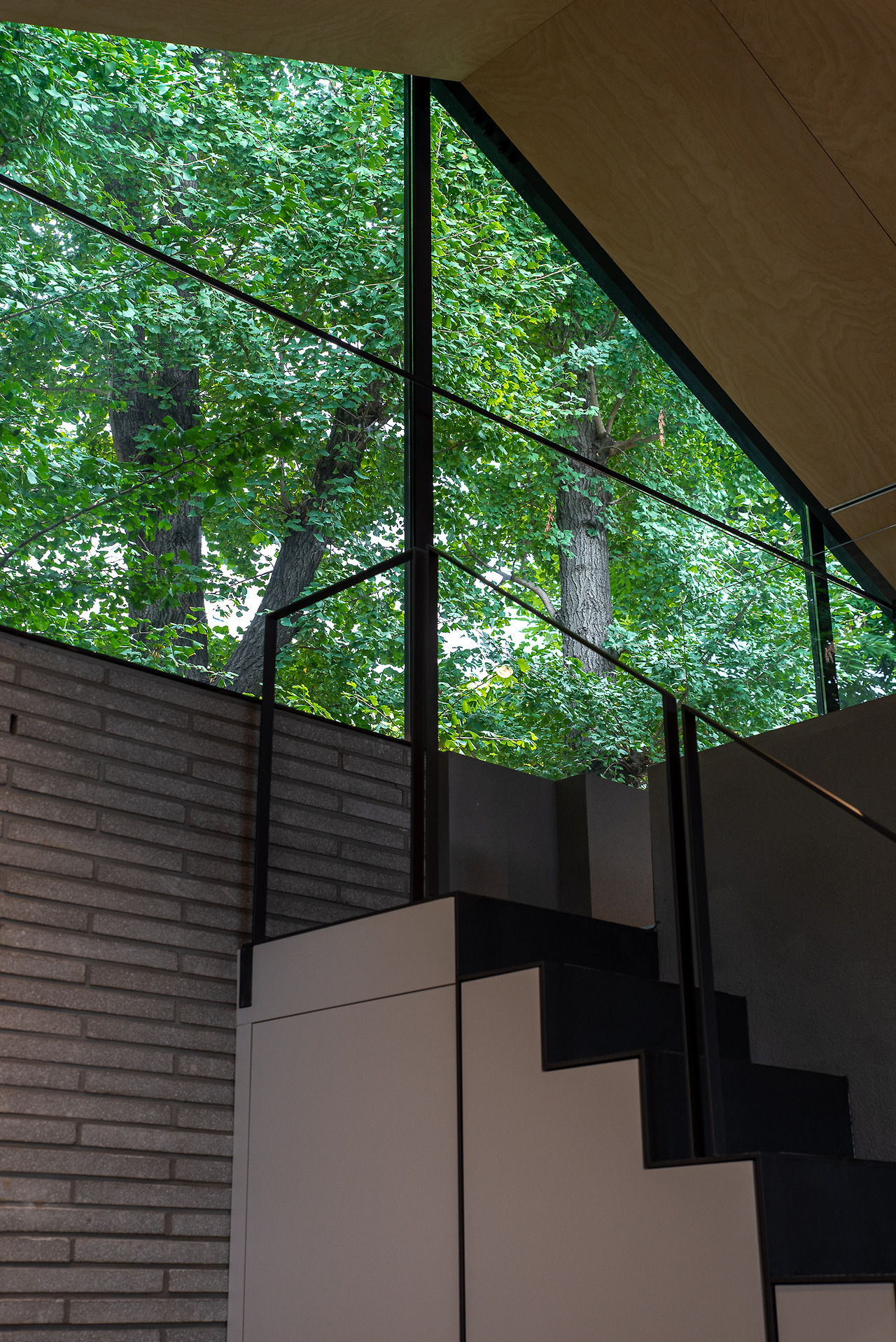 문을 열고 내부에 들어서면 널찍한 공간감에 시선이 크게 환기된다. 지붕과 외벽의 구조를 그대로 활용해 천장은 높고 폭은 넓은 공간을 확보했다. 목재로 마감된 천장과 온난한 조명의 조화는 따스하고 편안한 색감을 구현한다. 특히 감상에 있어 인상적인 점은 통창 밖으로 보이는 계절감이다. 실내에서 외부의 자연과 밀접하게 관계할 수 있는 이곳의 방식이 작은 혜택으로 다가온다. 공간의 흐름을 부각하는 코사이어티가 본인들의 공간을 시간과 계절의 흐름 속에 위치시킨 방법을 택한 덕이다.